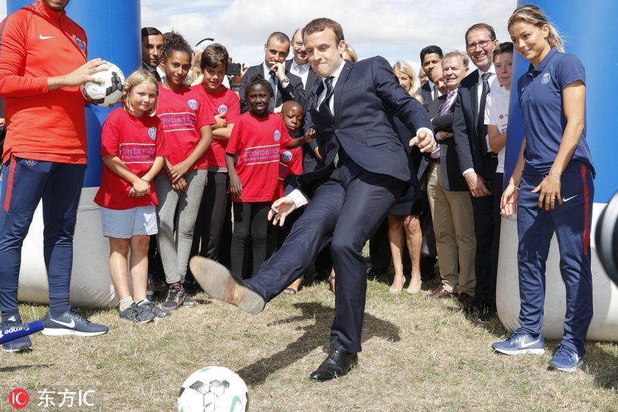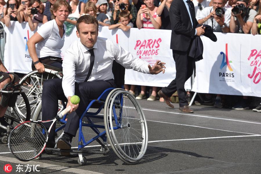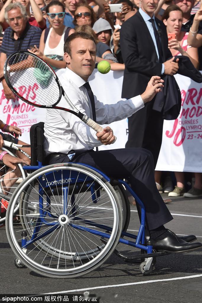 马克龙,踢足球必须用脚,打网球坐轮椅上也能打,就问你们总统运动的样子帅不帅?