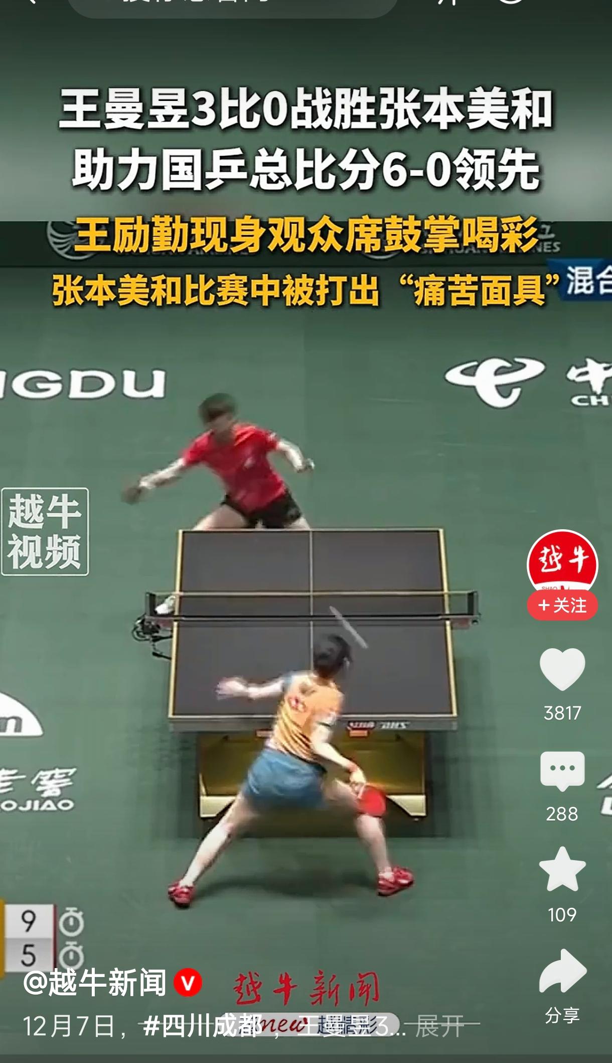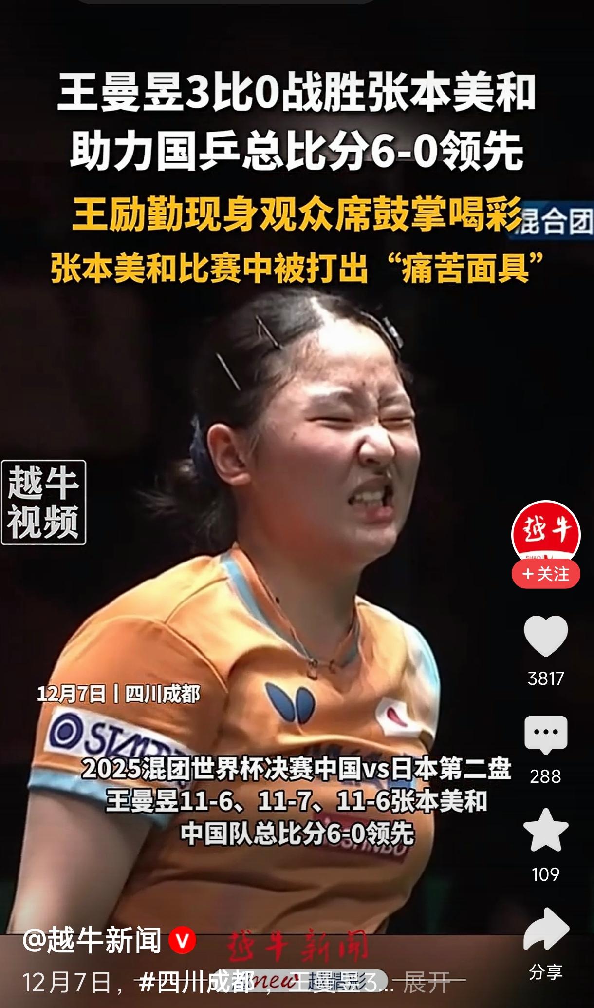 张本美和被打出“痛苦面具” 在12月7日举行的乒乓球混团世界杯比赛中,四川成都的比赛现场发生了一幕令人关注的场景。中国选手王曼昱以3比0战胜日本选手张本美和,为中国队赢得了关键一分,帮助中国队以总比分6比0领先。这场比赛中,张本美和在激烈的对抗中表现出明显的痛苦和沮丧,甚至被形象地描述为“被打出痛苦面具”。 比赛结束后,王励勤作为观众出席现场,为中国队的胜利鼓掌喝彩。这一场比赛不仅展现了中国乒乓球队的强大实力,也突显了张本美和在比赛中的情绪波动和压力。此次事件引发了网友的广泛关注和讨论,成为当日的热议话题之一。张本美和 张本美和表情包