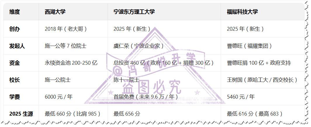 🔥民办大学天花板 PK!西湖 / 宁波东方理工 / 福耀科技谁能称王?曹德旺 vs 施一公的较量! 家人们!民办大学终于要出天花板了!西湖大学、宁波东方理工、福耀科技这三所「高起点民办」直接卷成 985 级别,今天来一场终极 PK👇 🎯 三校核心数据 Battle 💡 谁是未来王者? ▪️ 西湖大学:先发优势!8 年积累 + 全球 90% 海外博导,科研实力已显雏形~ ▪️ 宁波东方理工:资金最豪!460 亿砸向研究型大学,未来潜力无限! ▪️ 福耀科技:性价比之王!曹德旺背书 + 低学费,生源质量稳步上升! 如果分数够,你会选哪所?你觉得哪所会成为中国民办大学的 No.1? 民办大学天花板 西湖大学 曹德旺 福耀科技大学 宁波东方理工大学 高等教育