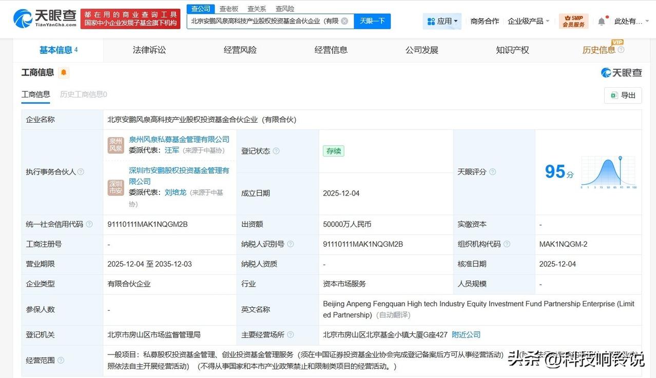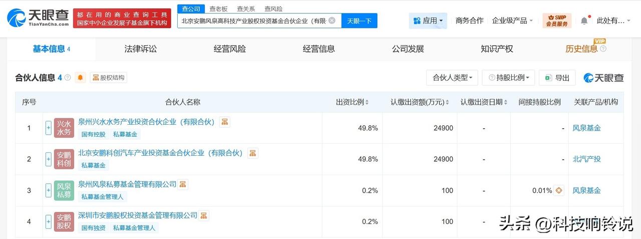 【北汽等成立高科技产业股权投资基金 出资额5亿】 天眼查工商信息显示,近日,北京安鹏风泉高科技产业股权投资基金合伙企业(有限合伙)成立,执行事务合伙人为泉州风泉私募基金管理有限公司、深圳市安鹏股权投资基金管理有限公司,出资额5亿人民币,经营范围为私募股权投资基金管理、创业投资基金管理服务。合伙人信息显示,该基金由泉州兴水水务产业投资合伙企业(有限合伙)、泉州风泉私募基金管理有限公司以及北汽旗下北京安鹏科创汽车产业投资基金合伙企业(有限合伙)、深圳市安鹏股权投资基金管理有限公司共同出资。 天眼查信息: