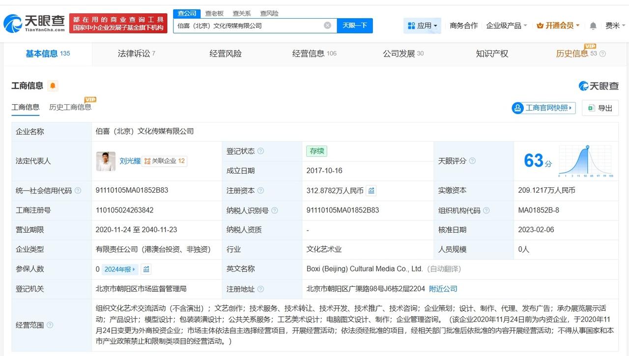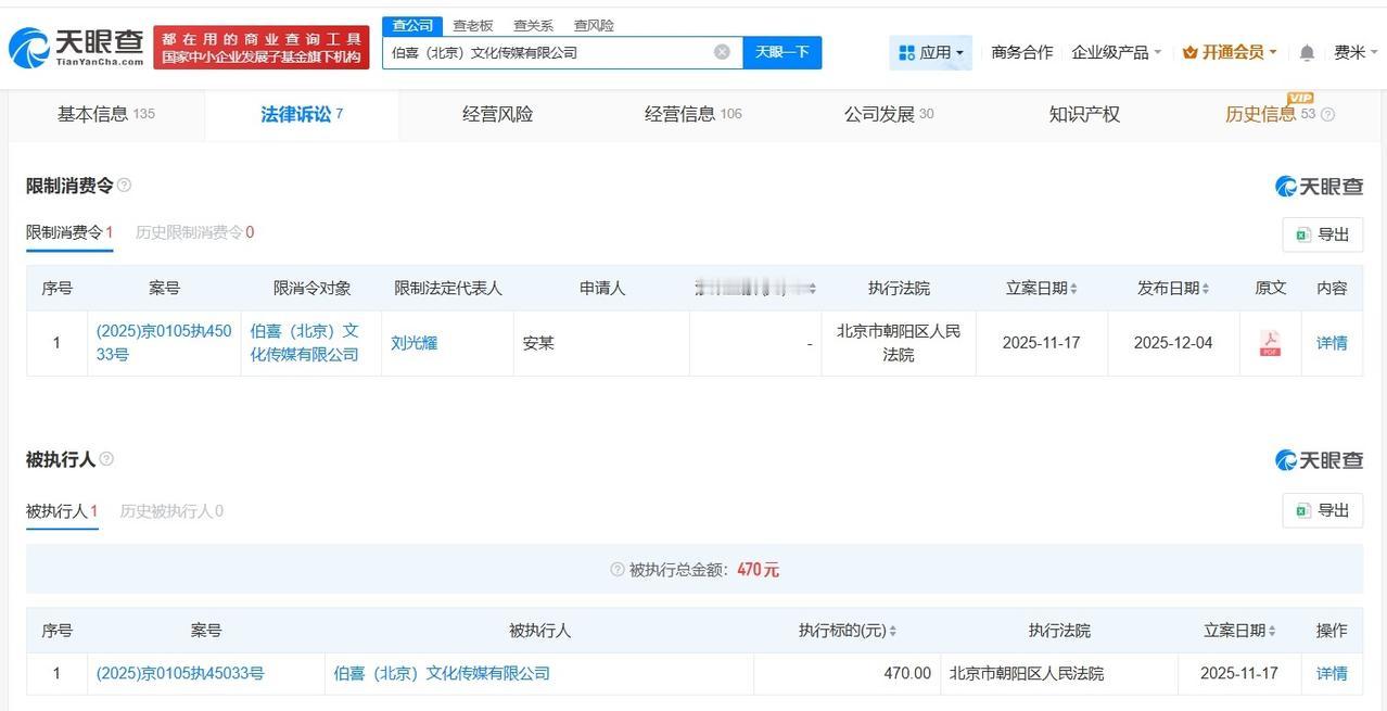 北大网红刘光耀被其前妻申请限消 北大网红刘光耀因470元案款被限消 天眼查法律诉讼信息显示,近日,伯喜(北京)文化传媒有限公司及其法定代表人刘光耀新增一则消费令,涉及股东知情权纠纷案件,申请人为刘光耀前妻安吉,执行法院为北京市朝阳区人民法院。案件流程信息显示,此前,该公司已因此案被执行470元。 伯喜(北京)文化传媒有限公司成立于2017年10月,注册资本约313万人民币,经营范围包括组织文化艺术交流活动、文艺创作、企业策划等,由刘光耀、YSC Bosie(HK)Limited、安吉等共同持股,其中安吉持股比例约3.4%。 据媒体报道,去年8月,刘光耀发表长文回应与前妻结婚、离婚及关系崩裂的始末,并针对骗婚、债务等问题向前妻提出质疑,引起网友关注。 天眼查信息:
