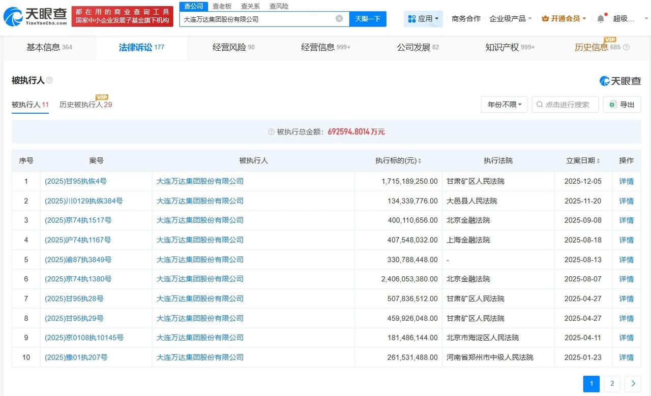 万达集团被恢复执行17亿 王健林名下公司被恢复执行17亿 天眼查天眼风险信息显示,近日,大连万达集团股份有限公司、万达地产集团有限公司等新增1条恢复执行信息,执行标的17亿余元,执行法院为甘肃矿区人民法院。 大连万达集团股份有限公司成立于1992年9月,法定代表人为王健林,注册资本10亿人民币,经营范围包括商业地产投资及经营、酒店建设投资及经营、连锁百货投资及经营、电影院线等文化产业投资及经营等。股东信息显示,该公司由大连合兴投资有限公司、王健林共同持股。风险信息显示,目前,该公司存在10余条被执行人信息,被执行总金额超69亿元。天眼查信息: