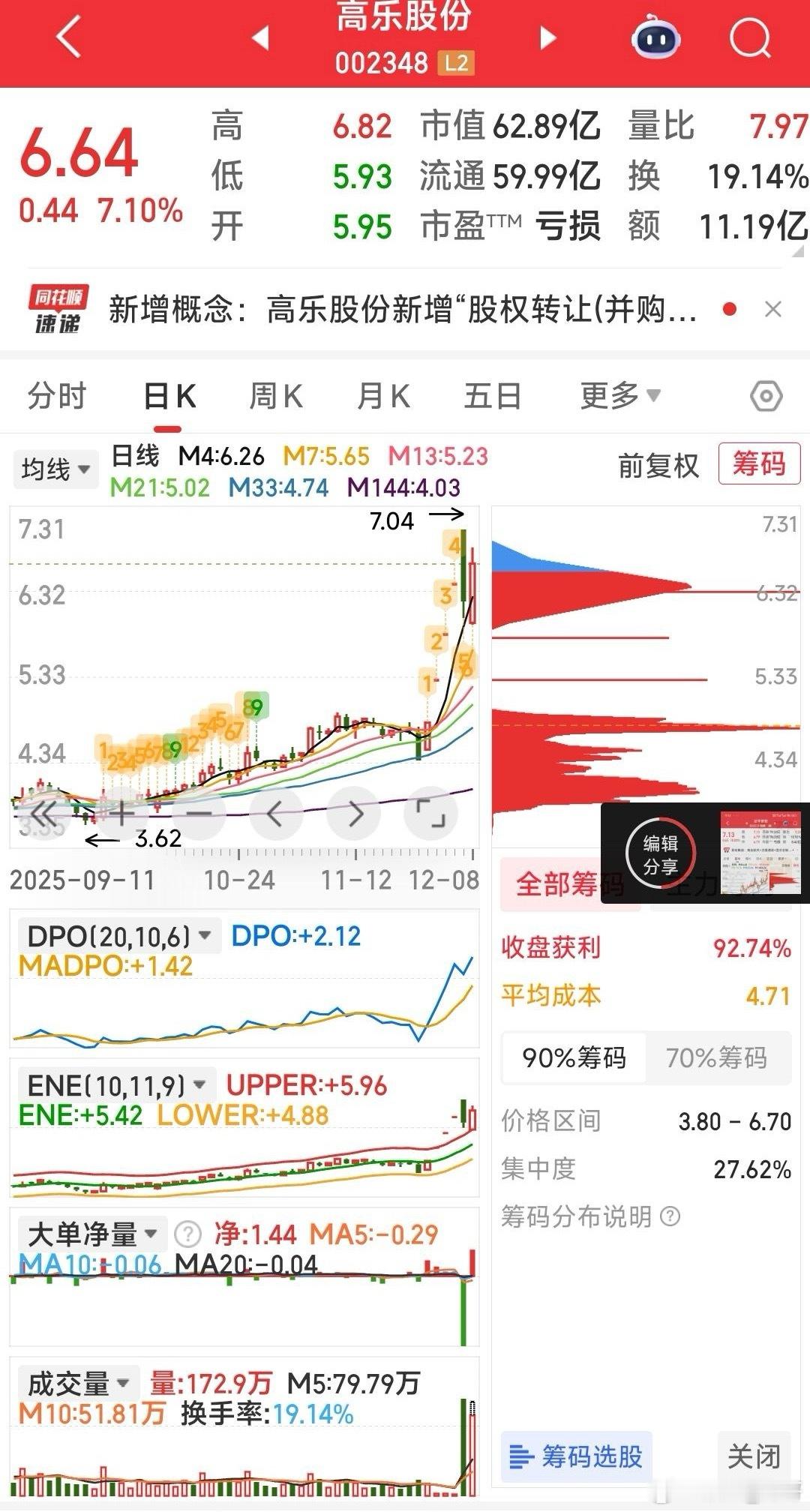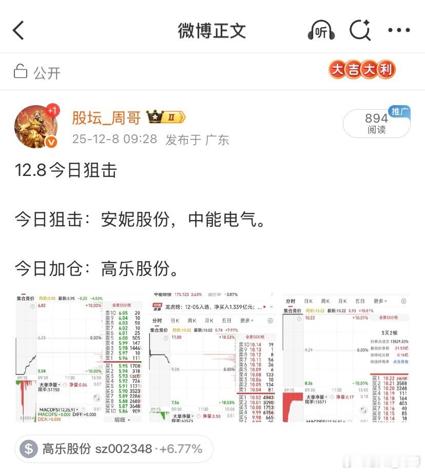 高乐股份集合价你干了吗?按第②种方式上升了。结论:高乐股份的周五操作完全是大佬之间的博弈,买者卖者都是通道高手,因此,从涨停买进者看,下周必会自救再起风云。自救方式有二种:①高开秒板,不给出局大佬再上车机会。②低开后拉升,先制造恐慌吸筹,再大幅拉高T出底仓,完成T+0降低成本,同时激活股票的牛妖气。若我是主力会偏向第②种方式操作。