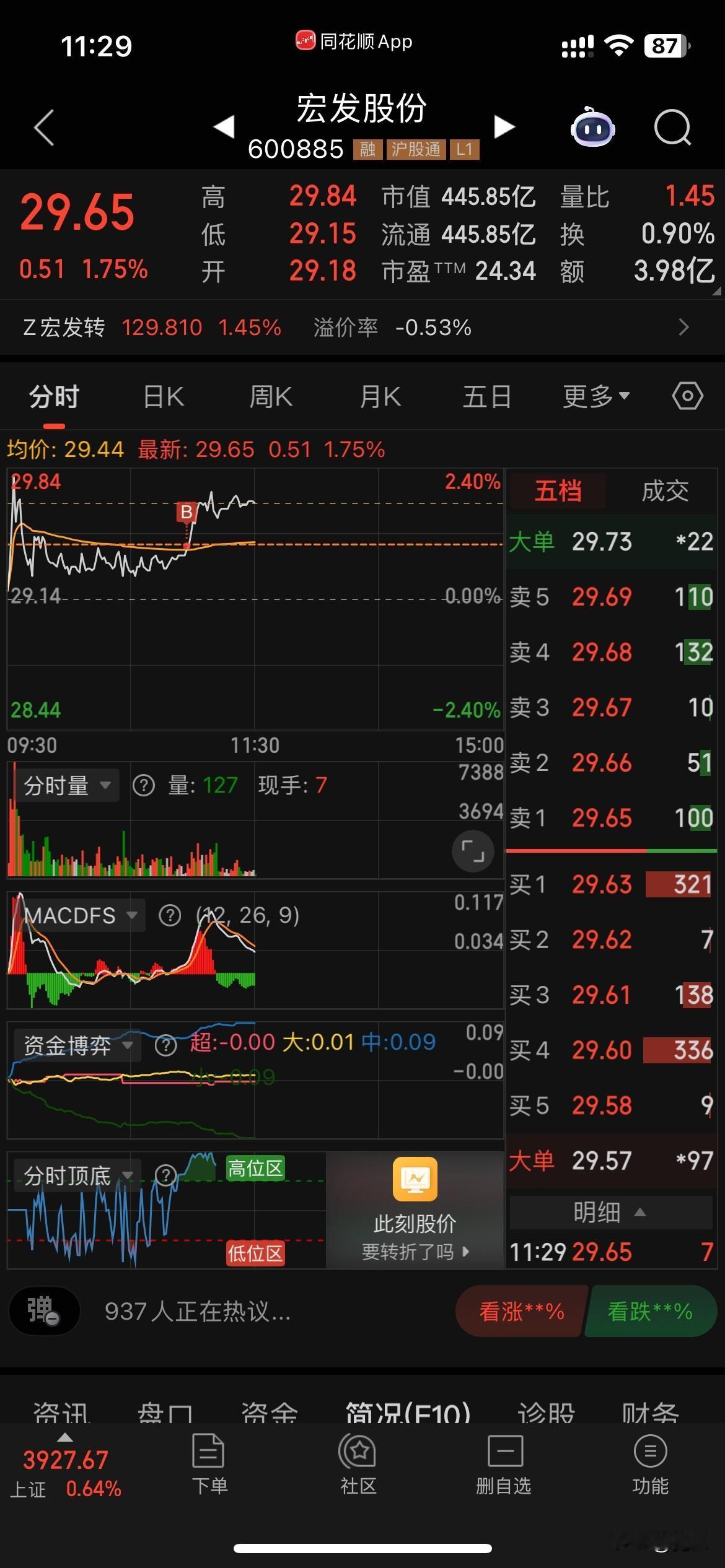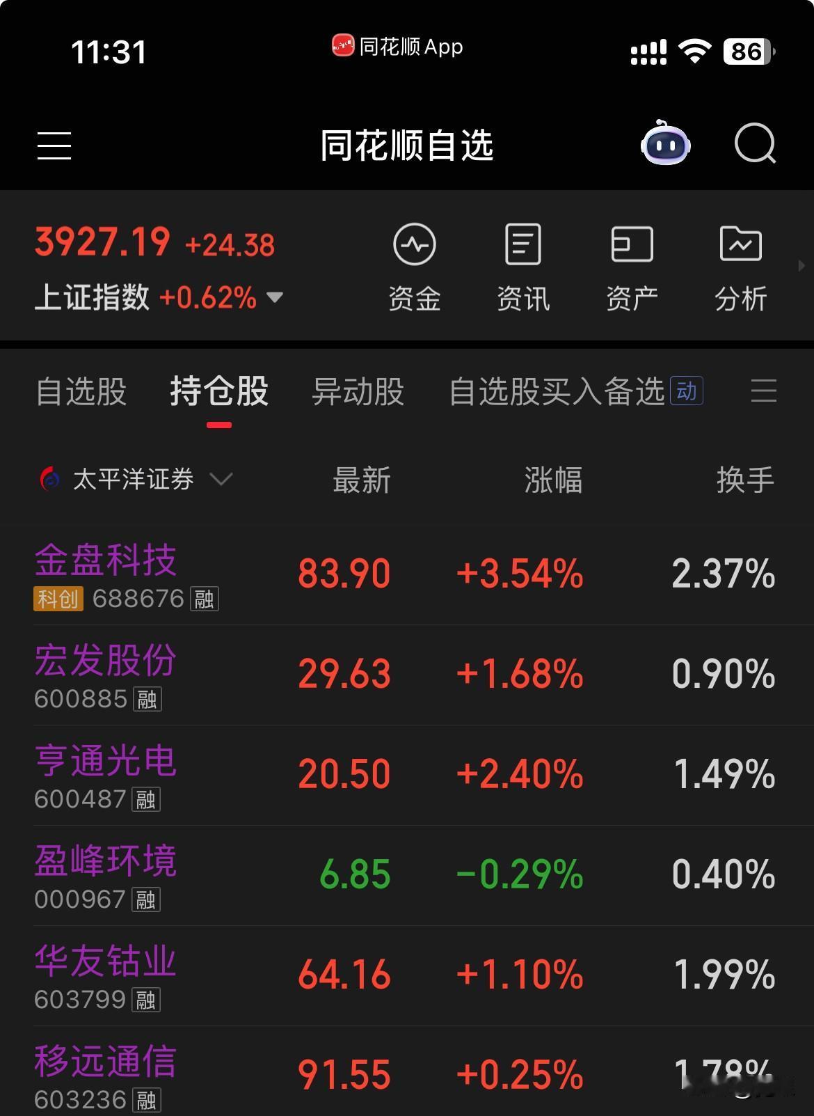 收盘了,在周末利好消息的发酵下,今天市场情绪大好,大盘放量几千亿。科技股在利好刺激下全面大涨。我早盘清空了火炬,厦钨和拓普。买入亨通和宏发。这两个股都是保险抱团重仓股,行业龙头。保险机构现在有钱了,估计还是加仓他们研究过并且很熟悉的股票。特别是宏发竟然被外资买得太多,被禁售了。低位我还少量买入了盈峰。目前4成仓左右。上午一顿操作猛如虎。红了1千5。又给券商贡献了不少佣金[捂脸]。我估计下午要震荡,但大幅回落可能性不大。毕竟大盘放这么大的量了。