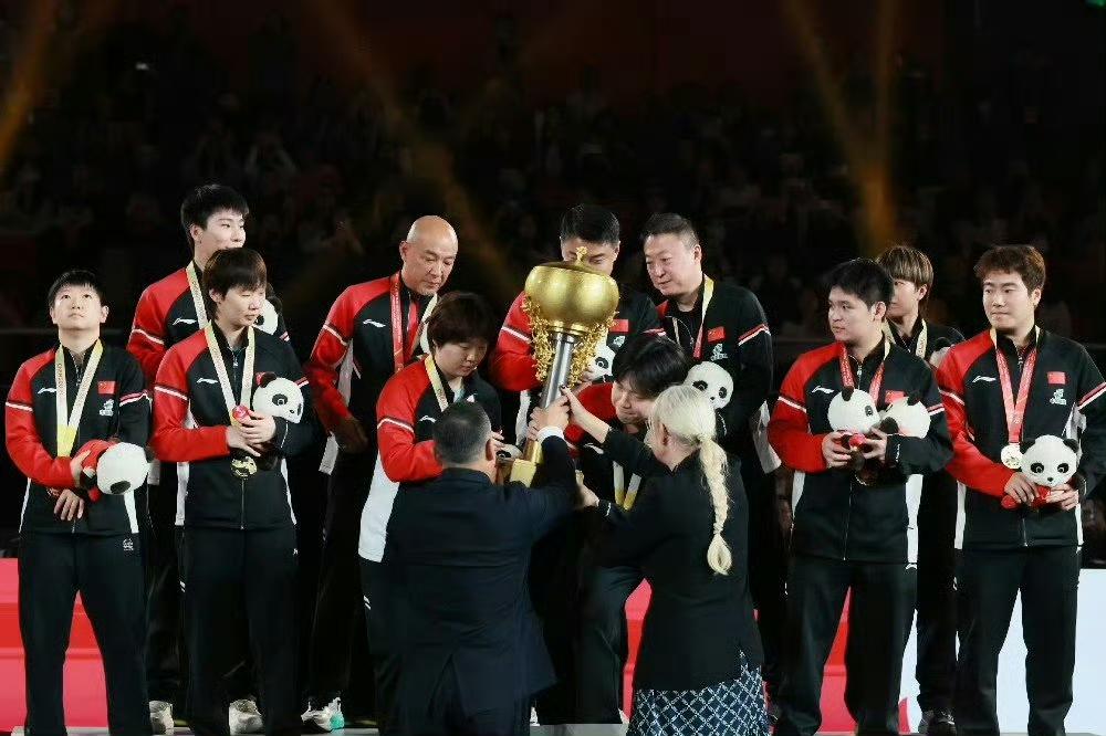 成都混合团体世界杯比赛决出冠军,中国队如愿捧杯!好久不见的刘国梁现身现场,为中国队颁奖。刘国梁将奖杯颁给王楚钦和蒯曼瞬间,国乒队员目光一起聚焦在刘国梁身上! 不过孙颖莎似乎看起来有心事?昔日作为刘国梁最爱女将,这次竟然看都不看刘国梁!