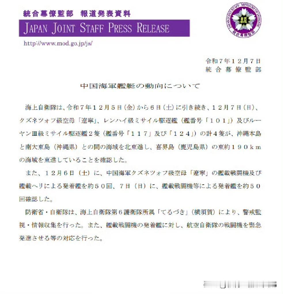 PLA巡视琉球群岛, 小日子内心相当憋屈。 2025 年12月7日,中国海军001 型航空母舰辽宁舰(16)、055 型南昌舰(101)、052D 型西宁舰(117)以及开封舰(124)共 4 艘舰艇,在琉球本岛与南大东岛之间向东北方向航行后,又在喜界岛以东约 190 公里海域向东航行。 #日本与中国竞争已感到绝望# #中日军机之间发生了什么# #日本自卫队滋扰辽宁舰训练#