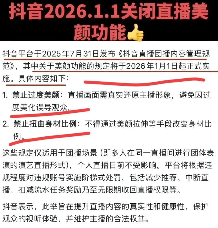 取消美颜!再过一个月,美颜滤镜就要“退潮”了。 这也是考验你们心中的女神是否抗的住无美颜无滤镜,能抗住的说明大哥你没宠错人! 网传消息称,2026年1月1日起,抖音将严禁过度美颜。这意味着今后看直播,屏幕里的人跟现实中的模样近似度会大幅提升,再也难见滤镜下的“失真颜值”。 2026年1月起,团播不能用那种“换头滤镜”了,磨皮磨到脸发糊、拉腿拉到比例失真的操作,全算违规。 这下,那些仅靠美颜撑门面的主播们怕是要慌了,不管男女,单靠颜值吃饭的路子难走了。 但咱普通个人直播没事哈,就针对那种多人团播(比如舞蹈团、合唱类),平台还说要用AI盯着,违规了直接限流icon、扣收益,严重的封账号。 尤其是不少颜值女主播,此前为她们豪刷的榜一大哥,得知她们的真实模样后,估计肠子都要悔青了! 那些靠颜值直播的美女们,估计收入少了不少,以后直播要真颜值,颜值打假,不过真假颜值都没我的份。大家都做回真实的自己。