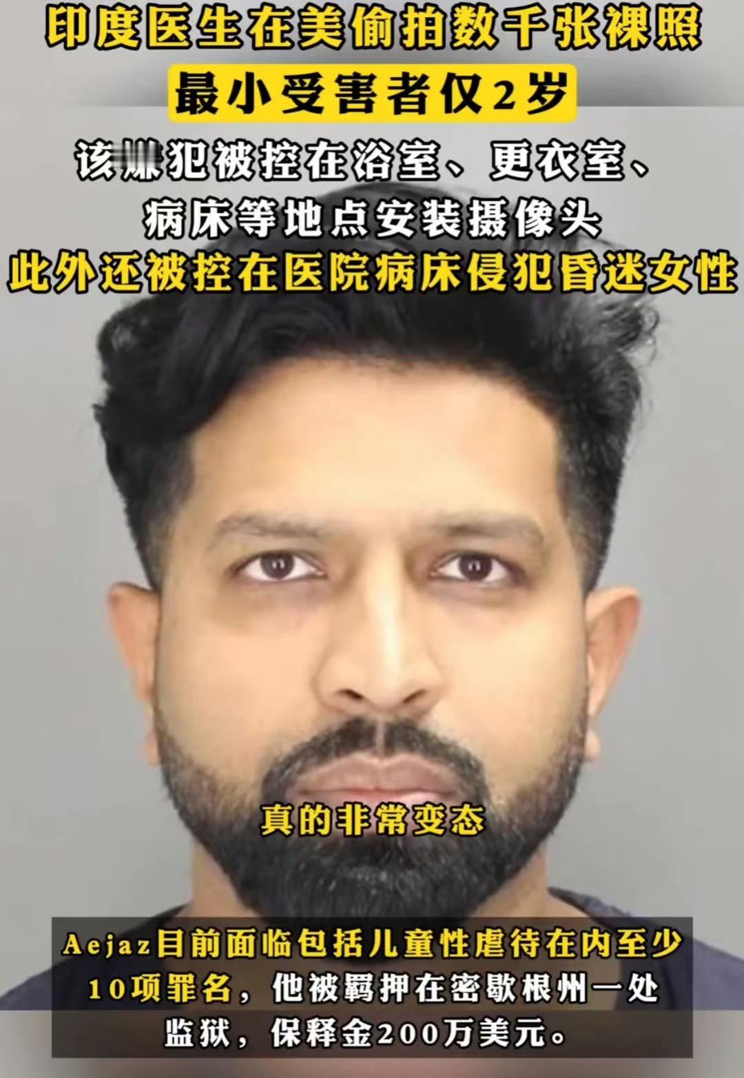 一名印度裔美国医生近日因为对8200多人实施性犯罪,被美国法院判处35-60年刑期。他之所以被绳之以法,是因为他的老婆实在看不下去他的变态行为,愤而举报。 这名医生名叫乌玛伊拉.艾贾兹,现年40岁。2011从印度持工作签证来到美国,在美国密歇根州奥克兰县一医院执业,任内科医生,能在美国做医生,说明他是一个相对勤奋和聪明的人。可是他却利用职务便利,干着龌龊的勾当。 在美国工作的头几年,他在医院风评不错,服务态度好,技术精湛。但是从2018年开始,罪恶的种子终于藏不住了,一直到2024年。他在密歇根州的多个医疗机构的浴室、病房、更衣室以及家中安装针孔摄像头,偷拍患者身体,年龄最小的受害者仅仅2岁。更是对一些昏迷的患者,他还实施性侵。 她的这些罪恶被枕边人老婆无意中发现,老婆看到这些照片、视频后无比震惊,不相信自己身边竟然睡着一个大变态,于是拿着这些证据勇敢向警方举报。 2024年8月,警察随即突袭了他的办公室和家,在6台电脑、3部手机以及15个硬盘当中,查获大量偷拍、性侵视频,光其中一个硬盘就存放有一万多个性侵视频,初步统计的受害者有8200多人。由于特殊原因,有些受害者并不知情,他们有些也不愿被提及此事,因为很多人也不愿意鼓起勇气公开指证他。 经过近一年的审理,真相全部浮出水面。美国舆论对这一起震惊全美的性侵事件有了诸多讨论,像医生的职业操守问题,还有特殊公共场合的安全监管问题。这个印度裔美国医生乌玛伊拉.艾贾兹已经接受法律的审判,这辈子别想出来了。