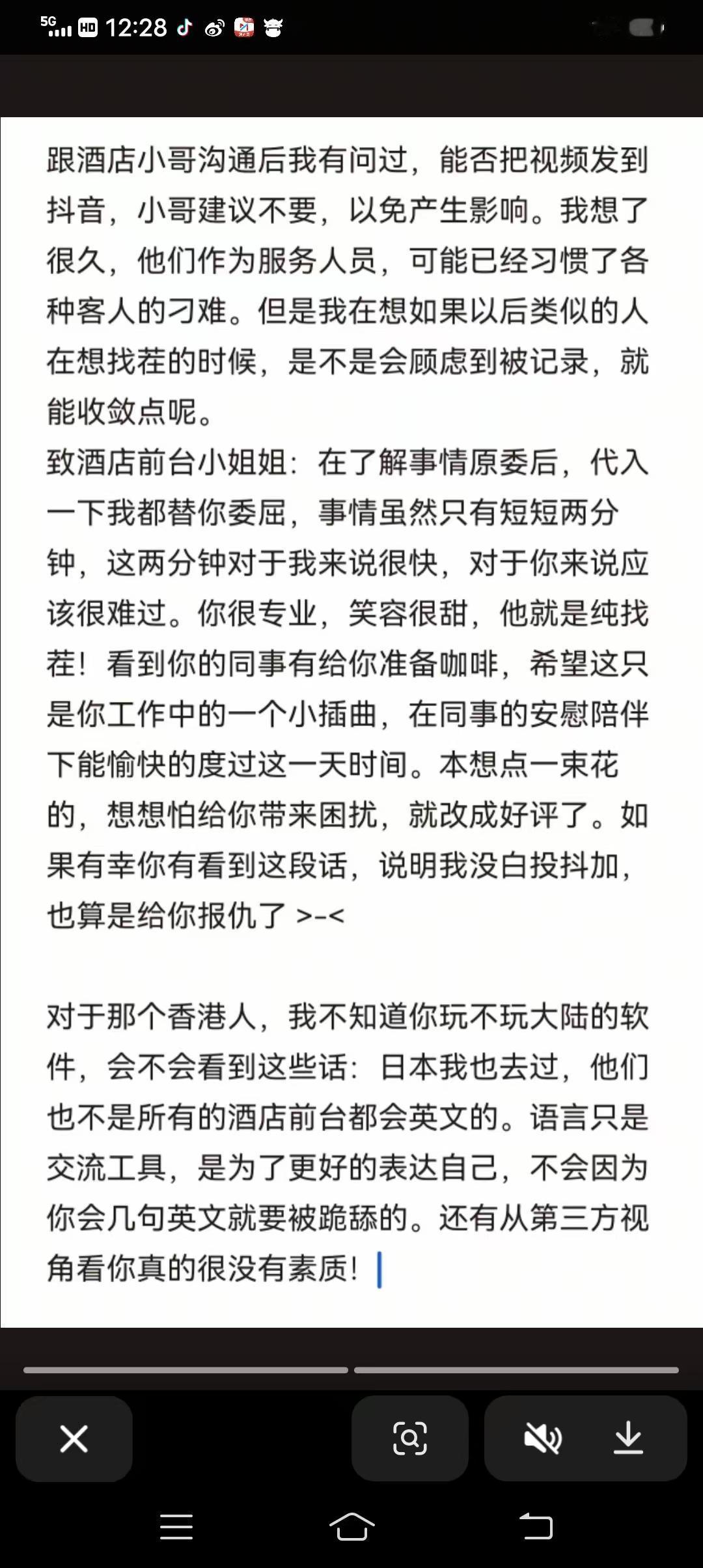 一香港男子在酒店大厅大骂前台小姐姐,只因为前台有人不会英文,没用英文服务他…… 视频发布者称:前台小姐姐走开后,该男子接了一通电话后就独自离开了…… 评论区网友表示: 笑死了,中文英文混着说还有脸让别人用英语招待他,正常有问题解决了才会走的,这就是典型的没事找事! 该说不说,这样的人还是有一定群体的,在家里和单位像孙子一样,到外面就横的不行,好像别人都欠他们钱一样。 评论区的网友们,你们怎么看?