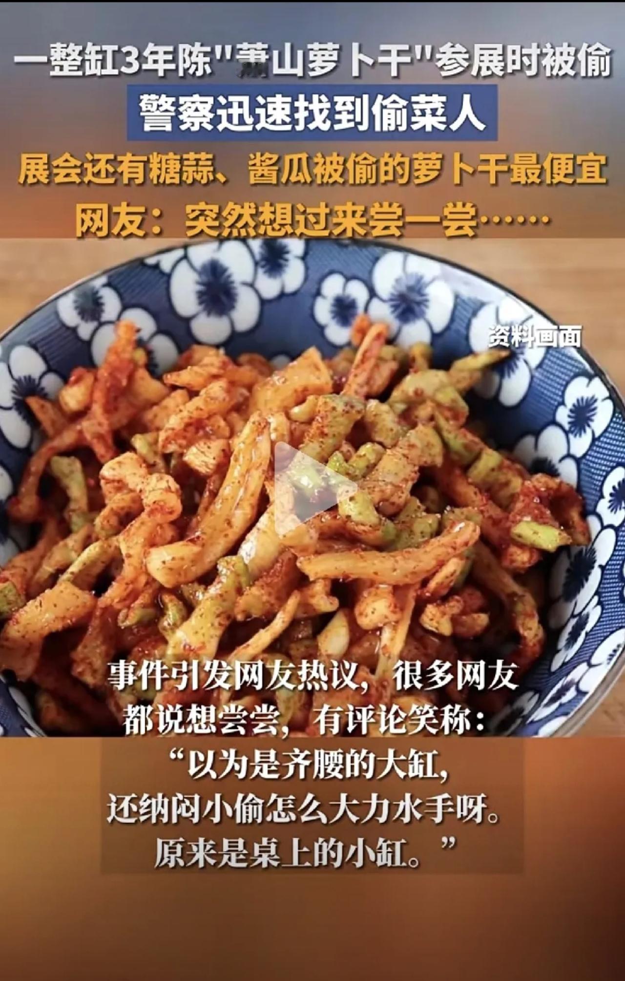 杭州老博会“咸菜大盗”横空出世,俩阿姨扛走20斤非遗萝卜干 杭州老博会一大早,“王泰和”展位直接炸了——装着20斤三年陈非遗萝卜干的陶缸,居然被人扛走了! 监控一查,好家伙!清晨六点,俩看着像母女的大妈,合伙把沉甸甸的陶缸“连锅端”,扛到运河边倒出萝卜干装袋,转头就把传承百年的非遗陶缸扔路边了! 商家八点报警,中午就破案!大妈们压根不知道偷的是“三晒三腌”的非遗宝贝,最后赔了230元,商家也大度原谅。 谁能想到,这事儿一上热搜直接疯传!网友笑疯: 👉“最高级美食认证:好吃到要偷!” 👉“230元买三年时光的味道,阿姨血亏啊” 👉“建议改名‘偷不着馋哭款’萝卜干” 更绝的是展位卖爆了!无数人专程打卡:“就要被偷同款!” 旁边倒笃菜补货两次都抢空,老字号直接官宣要出“好吃到被偷”新品,包装画俩大妈扛缸跑! 小编真的笑不活了!偷窃肯定不对,但这波“意外广告”也太硬核了~ 能让阿姨铤而走险的萝卜干,到底香到啥程度?你们敢试试吗? 学历高的人,素质和教养就一定高吗三年陈“萧山萝卜干”参展时被偷
