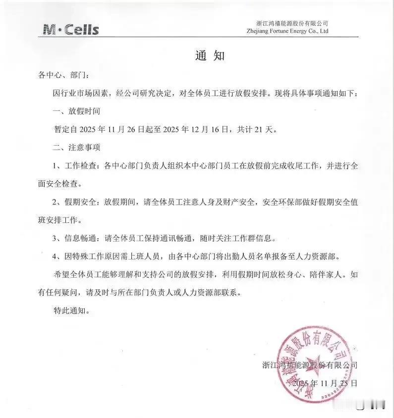 光伏行业进入寒冬,倒闭的倒闭,放假的放假,两家大型企业通告员工。2025年底将至,浙江鸿禧能源公司决定给全体员工放假21天,新一新能源(衢州)科技有限公司直接停业遣散所有员工。 据了解,浙江鸿禧能源公司还在2024年申请IPO上市,最终没有在创业板融资成功,结果2025年就撑不住了,果然是上市就是准备卖公司,如果上市成功股民们又是入套。 而新一新能源(衢州)公司注册资本5亿多元,成立于2023年,计划投资65亿元生产光伏设备建设8GW光伏电池和12GW光伏元件等,但是2025年10月底公司通知因国家对光伏产业调整,公司全面停工停业。 光伏企业进入寒冬多家公司宣布停产放假 光伏行业困境 光伏退潮