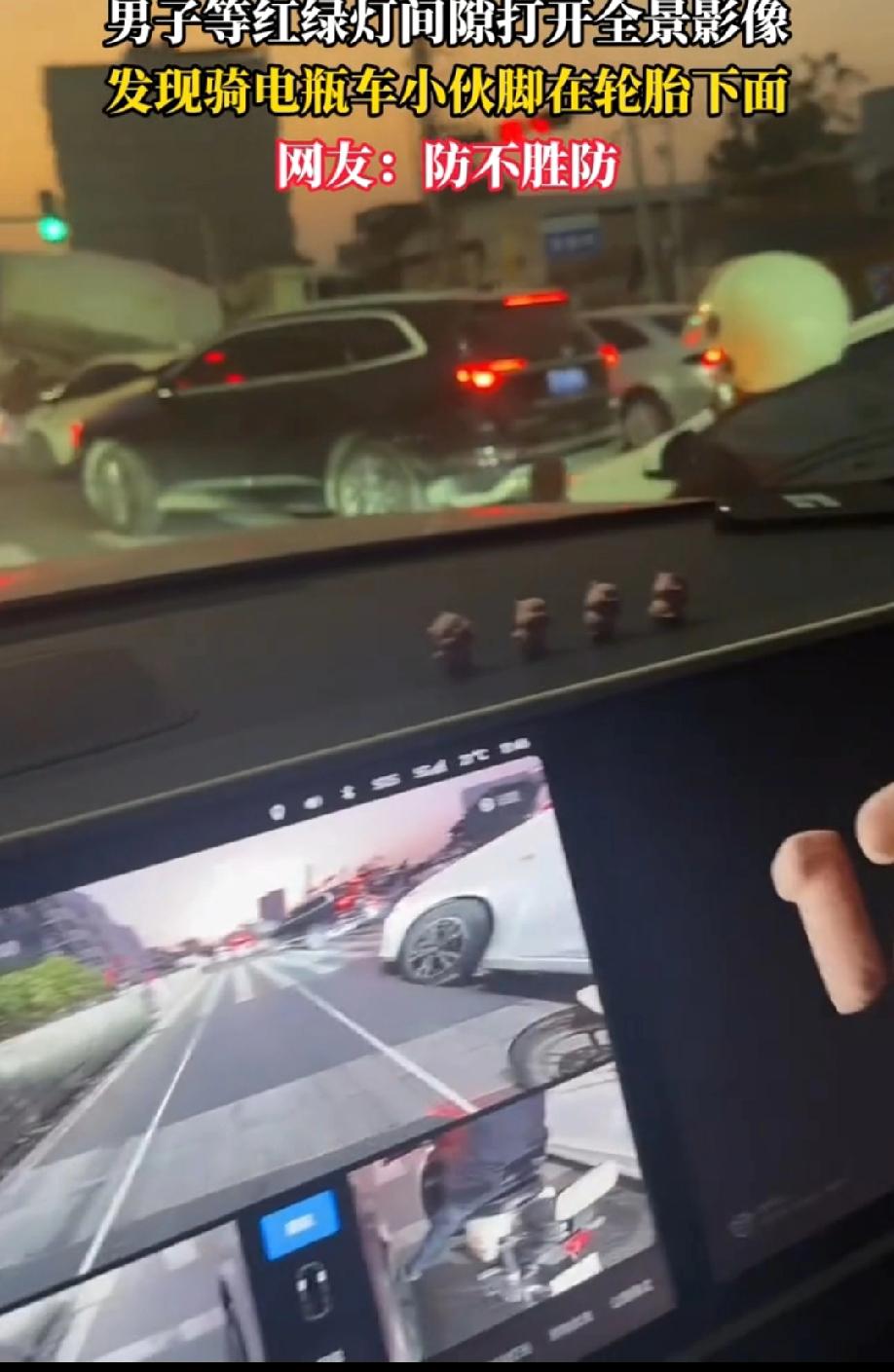 碰瓷新套路:值得注意! 一男子等红绿灯间隙打开车的全景影像,发现电瓶车小伙脚在轮胎下面。电瓶车停在车旁边,脚非要伸那么远?这明摆着就是想碰瓷,讹钱啊! 多亏男子车上有全景影像,得亏打开了,否则绿灯一亮,车一开,这脚肯定压到。现成的证据,建议直接报警:碰瓷敲诈! 以前都是从小教育躲车,离车远点保证安全,现在这世道变了?自己往车上凑,还贴得这么近,甚至还发展成职业了。真是为了钱,啥都做得出来。