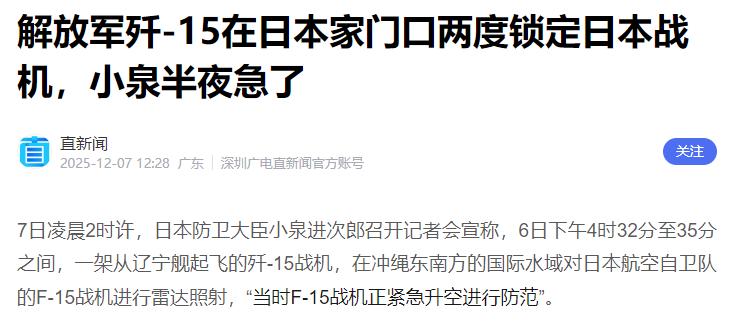 开始上强度了,就差直接发射,让它喂鱼去! 12月6日这天,咱们的辽宁舰航母编队正在西太平洋公海搞正常演习,提前都按规矩通报了演训区域,结果日本航空自卫队的F-15战机硬是凑过来找存在感。 当天下午四点多,一架歼-15正练着触舰复飞呢,日方那架F-15突然从后半球高速切进来,最近的时候俩机距离还不到50公里,直接把咱们的训练给搅黄了,歼-15只能放弃科目复飞拉起。 飞行员先是按规矩伴飞、摇机翼、用国际频道喊话警告,可日方跟没听见似的。没辙,只能开启火控雷达,对着它间歇性照了3分钟,这才把它逼走。 本以为这就完事了,没想到小鬼子还挺执着,晚上又派了两架F-15组成编队,想从侧后方偷偷摸摸抵近拍照。这次咱们两架歼-15直接上去,一前一后把它们夹在中间,其中一架持续间歇照射锁定了31分钟,直到日方战机彻底放弃任务,灰溜溜掉头往西跑了才解除跟踪。 有人可能不懂火控雷达锁定意味着啥,这可不是普通的扫描探测。一旦被盯上,对方战机上的告警器会一个劲闪红灯,还发出刺耳的声音,就跟被枪口瞄准了似的——导弹已经进入待命状态,就等飞行员按按钮了。 咱们搞间断性照射,意思很明确:你已经在射程里了,但我们不想先动手。 结果日本防卫大臣倒打一耙,凌晨开记者会说咱们"危险",要抗议。国防部很快就戳破了他们的把戏,明明白白指出是日方蓄意挑衅在先,咱们是正当防卫。 这事儿根本不复杂,就像在自家院子练功夫,有人非要翻墙进来瞅,警告不听还往里闯,难道不该亮出家伙让他知道厉害? 这种事其实也不是头一回了,2014年东海防空识别区那次,日本F-15抵近咱们苏-30,被火控雷达锁定后也是赶紧放干扰弹跑了。 咱们一直守着"不开第一枪"的原则,但也绝不会让别人随意挑衅。辽宁舰编队在公海训练,完全符合《联合国海洋法公约》,日方一次次派机骚扰,说白了就是想试探咱们的底线。 这次咱们的处置既专业又强硬,既没让演习受影响,又没把事情闹大。火控雷达照过去,就是告诉日方:别拿客气当软弱,咱们的肌肉不是谁都能随便碰的。 真要是逼急了,那可就不是警告这么简单了,到时候想跑都来不及。