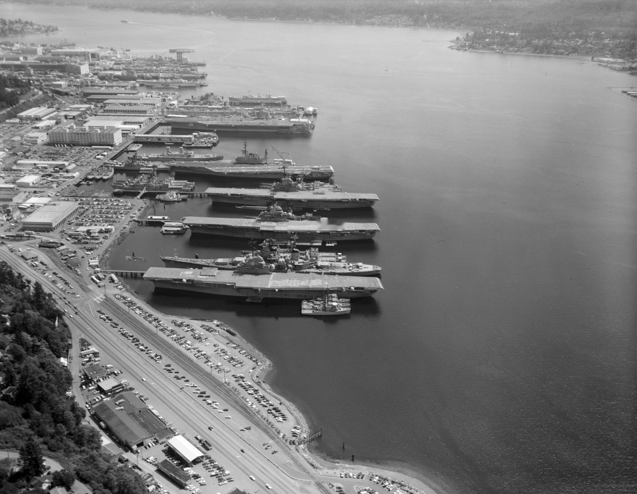 不对比体现不出衣阿华级战列舰有多大! 图1:1993年5月17日,退役战列舰新泽西号(BB-62)及七艘退役的诺克斯级护卫舰停泊在华盛顿州普吉特湾海军造船厂。 图2:1992年8月,同样在华盛顿州普吉特湾海军造船厂,左侧是“大黄蜂”号航母(CVS-12)以及三艘扫雷舰,右侧是新泽西号战列舰以及两艘诺克斯级护卫舰。 图3:1992年8月,华盛顿州普吉特湾海军造船厂的封存舰队,从前往后依次为:大黄蜂号(CVS-12)、新泽西号(BB-62)、“奥里斯坎尼”号(CV-34)、本宁顿号(CVS-20)和中途岛号(CV-41)。背景中可见现役航母尼米兹号(CVN-68)和卡尔·文森号(CVN-70)。