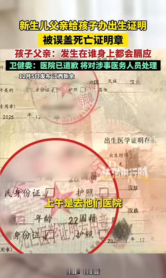 太让人难受了!江西新余,黄先生给刚出生的孩子办证,拿到手一看,出生证明上竟然被盖成了“死亡证明”! 黄先生怎么都没想到,人生中这份最重要的文件,竟然被工作人员“随手一盖”,让他一下子从喜悦变成了焦虑。12月5日,江西新余的医院里,黄先生本来高高兴兴地去领孩子的出生证明,结果工作人员递过来的却是一张盖着“死亡”印章的证明。黄先生火冒三丈,立刻质问,工作人员一句“盖错了”把气氛推向高潮。 其实很多人都经历过类似的“乌龙时刻”,只不过没这么荒诞。办证这事儿,说穿了是个“流程活”,可一旦出了岔子,就能让小事变闹剧。 到底是谁在敷衍?到底是谁在消磨百姓的信任? 黄先生的遭遇,不是个例。小孩出生,按理说全家都该喜气洋洋,领到证明那一刻,多少人会泪目。 但现实里,总有一些“流程机器人”把这份人间烟火搓成一团乱麻。你辛苦排队、材料递交,一环扣一环,最后却被一颗“错章”砸得心里发凉。 黄先生形容:“我家孩子刚出生,这证明就是他来到世界的第一份见面礼,结果盖成‘死亡’!你说换谁受得了?”而工作人员只是轻描淡写一句“盖错了”,好像这不是大事。 你以为的“盖错了”是小事,人家心里却是大事。就像你吃米饭,突然发现里头有颗小石子,不磕掉牙也会心里一紧。 “流程社会”,最怕的不是机器没灵魂,而是人也没灵魂。 大家都能理解,谁还没个出错的时候?可服务行业,尤其是这种一锤定音的证明文件,马虎不得。就算你再忙,也不能把新生儿的“人生第一证”搞成乌龙。 如果你觉得盖错章没啥大不了,建议你换位思考:你要是办了个结婚证,结果盖成“离婚”,你还笑得出来吗? 服务窗口不能只讲流程,更要多一点尊重。你面对的是活生生的人,是全家人的希望,不是流水线上的编号。 “盖个章而已,多大点事!”可惜这句话,听起来比“盖错章”还让人心凉。谁都不盼着出错,但更怕的是错了没人当回事。 事情闹大后,医院道歉,涉事人员被处理,黄先生一家也算得到了安抚。可这场风波里,最难消化的,是那种被“流程机器”支配的无力感。 黄先生后来回忆:“医院态度还算好,事后也道歉了,可我总觉得,孩子来这世上的第一份文件,多少沾了点晦气。” 医院的道歉固然必要,但道歉不是万能胶。谁能保证下次不会有别的黄先生,再被“流程的冷漠”绊一跤? 有人说,咱们国家啥都讲“以人为本”,可一到窗口,怎么就剩下流程和冷漠了? “对事不对人”,一到窗口就成了“只认章不认人”。其实服务本来是“润物无声”,结果一搞出乌龙,全网都能听见“滴水穿石”的冷漠。 办证服务,成了新一代“抽盲盒”,每次递材料都得默念“保佑别出差错”。其实大家要的真不多,就是别在关键环节掉链子。 出生证明不只是一张纸,它是孩子“合法来世界报到”的通行证。每一个为新生命忙前跑后的父母,内心都揣着一份对未来的期盼。 可一纸证明盖错了章,所有欢喜瞬间变成了愤怒与不安。这不是小题大做,是对生命的基本尊重。 多少人吐槽服务行业“只认章不认人”,其实背后是对生活的无奈。你排队半天,材料准备得妥妥帖帖,就盼着那一刻能顺利完成,可现实却让你体验“从天堂到地狱”的落差。 谁都不想为别人的疏忽买单,可偏偏责任心和敬业精神成了稀缺品。 社会在进步,服务也要跟上节奏,不能还停留在“态度冷漠+流程主义”的老路上。 每一个盖章的人都该明白:你手里的章,直接影响着一个家庭的幸福和尊严。 少一些“盖错了”,多一些“辛苦了”,才是大家都想看到的景象。 你办证时遇到过哪些“奇葩乌龙”?你觉得服务窗口该怎么改善?你还见过哪些小失误引发的大尴尬? 【麻烦您点击“关注”,多多点赞、评论、收藏,成为我的铁粉,致力于每天把知识和快乐带给您[玫瑰]】