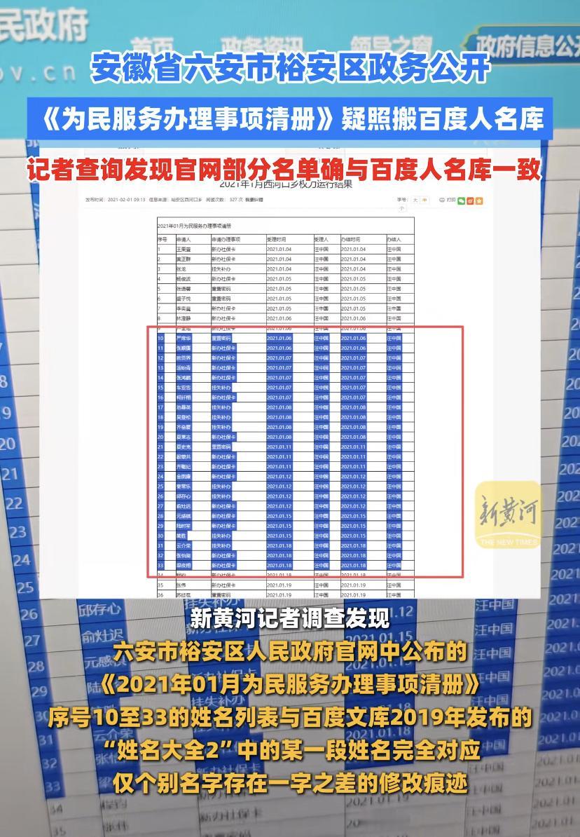 六安市裕安区政务公开照搬百度文库名称! 六安市裕安区政务公开《为民办理事项清册》除了前几名是真正的名字之外,后面的基本上就是照抄百度文库,其中对几个人的名字进行了部分修改,但是顺序是完全相同的。 随着这几天媒体越扒越深,越来越多的地方,被大家发现了名字存在问题,所谓的公布事由直接照抄百度文库。 各位是怎么看的?欢迎评论区留言。