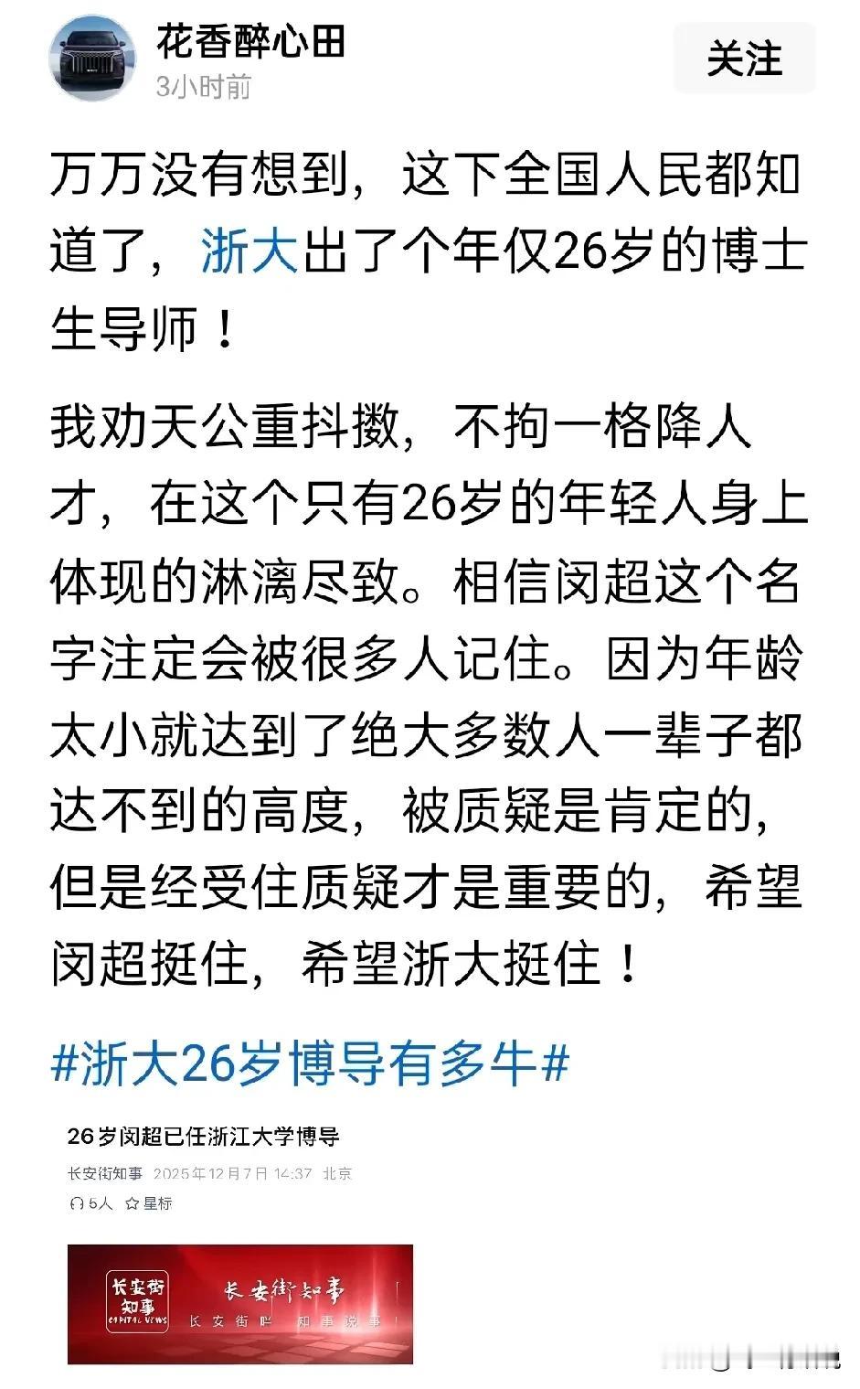 为什么浙大26岁的马院博士生导师闵超引起的反响这么大 大概也是物以稀为贵罢了 毕竟,研究马列的学院和人很多,但是这么年轻的博士生导师在生活中太少了 优秀的年轻人才太少,就难免遭人非议 相信以后随着这个专业的优秀年轻人才越来越多,大家也就习以为常了 毕竟全国那么多马院,需要更多的如同闵超这样优秀而年轻的人才