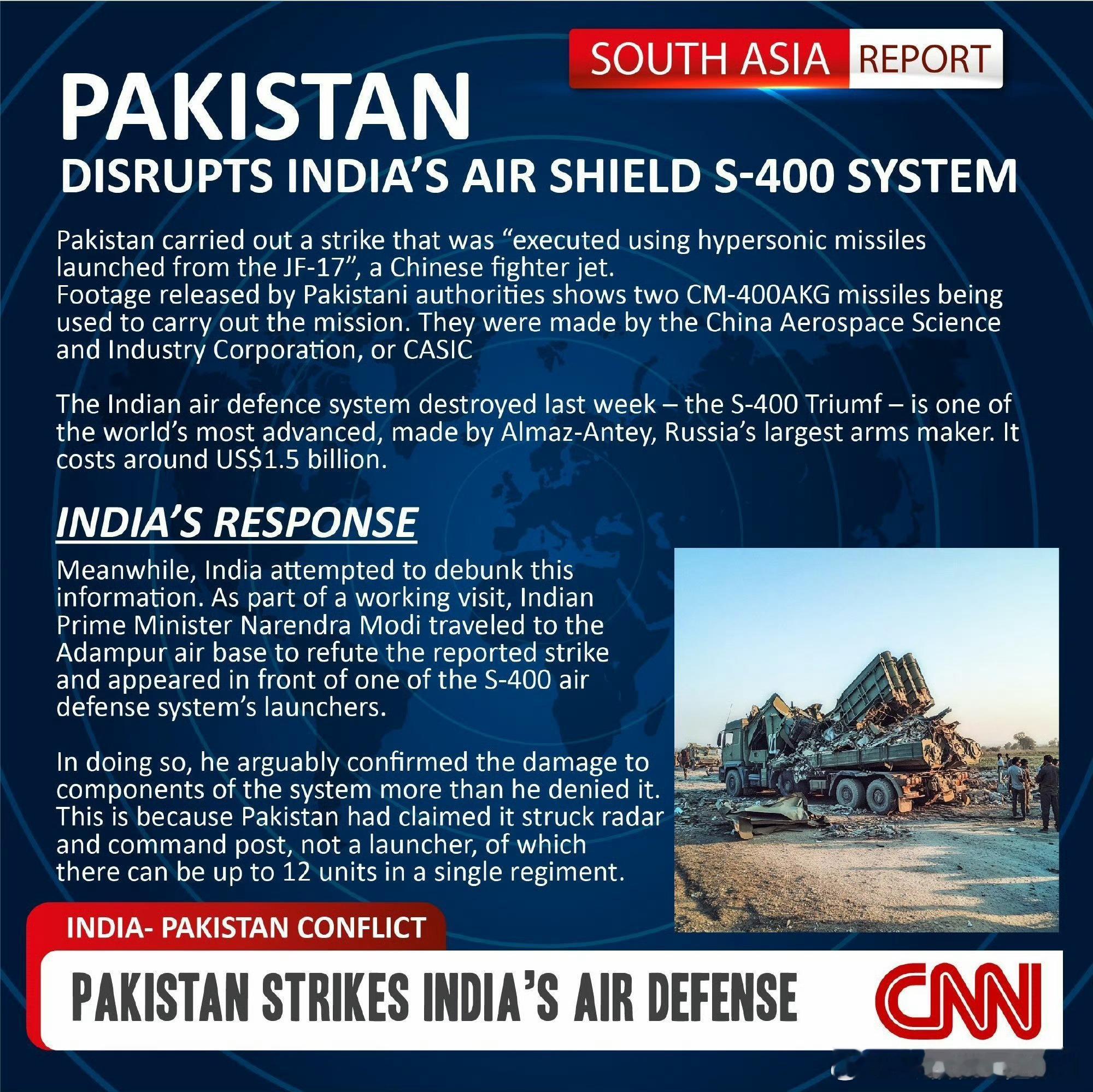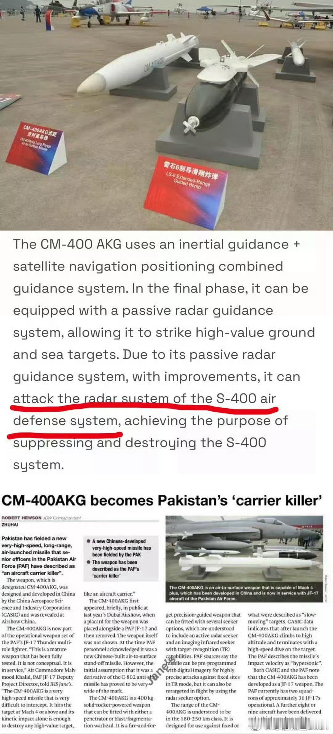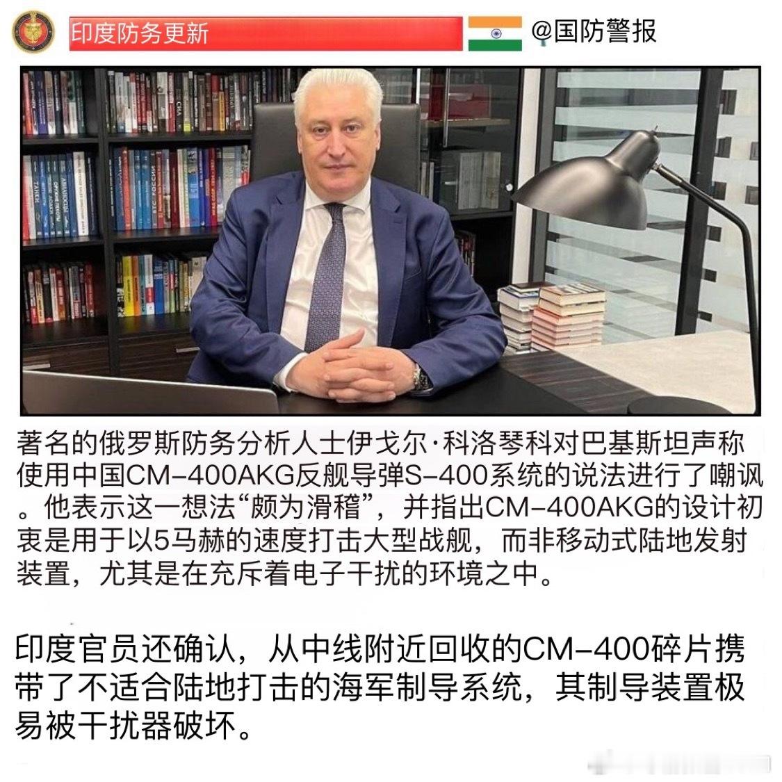 日耳曼赢学每天认识一件兵器 严肃驳斥伊戈尔.科洛琴科谬论➡️图2是图1机翻,毛子声称CM400AKG是反舰导弹、所以不能打击地面移动S400?那么图3的KH31A和KH31PM都是KH31,怎么就既能反舰又能反辐射了?你KH31导引头技术差需要切换不同导引头打击不同类型目标而已。举个例子HHQ9E既能防空也能反舰/对面,而你S400哪个导弹会反舰了?➡️根据图5和图6展板、文章证明CM400AKG本职不是反舰导弹、而恰恰是反辐射导弹,比M31火箭弹更专业对口、打的就是你S400雷达车。图10的S400发射车被更不专业的海马斯M31火箭弹炸毁、你怎么不提你的S400陆地部署机动性了?你S400根本没有行进间射击能力,只会展开部署,是个相对静止的固定目标吹什么野外机动性?➡️图7~图9都是CNN、印度本地媒体报道S400遭到CM400AKG打击后出现重大损失和人员损失。