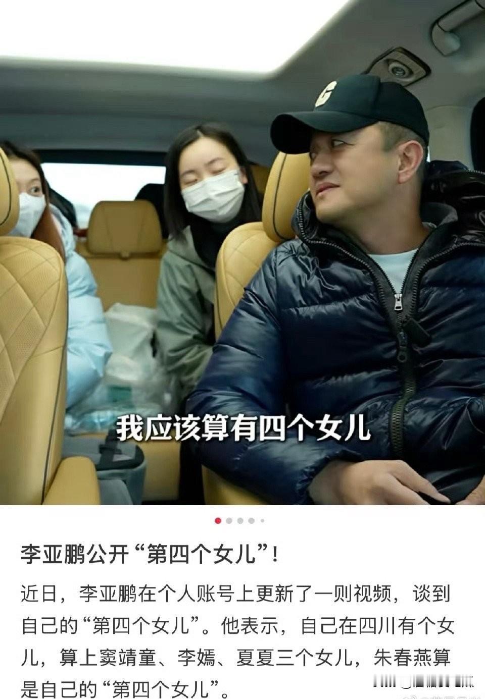 李嫣很爱她的父亲李亚鹏大家都知道 他有三个女儿大家也知道 李亚鹏不说都没人知道,他竟然有4个女儿,大女儿窦靖童,二女儿李嫣,三女儿夏夏,这是大家都知道的,但其实他还有一个女儿那就是朱春艳。 朱春艳是李亚鹏和王菲一起救助的女孩子,四川人,今年32岁了,多年来一直和李亚鹏保持联系,李亚鹏更像是父亲一样的存在。 李亚鹏行商确实不行,但是这些年慈善是真的一直在坚持做。