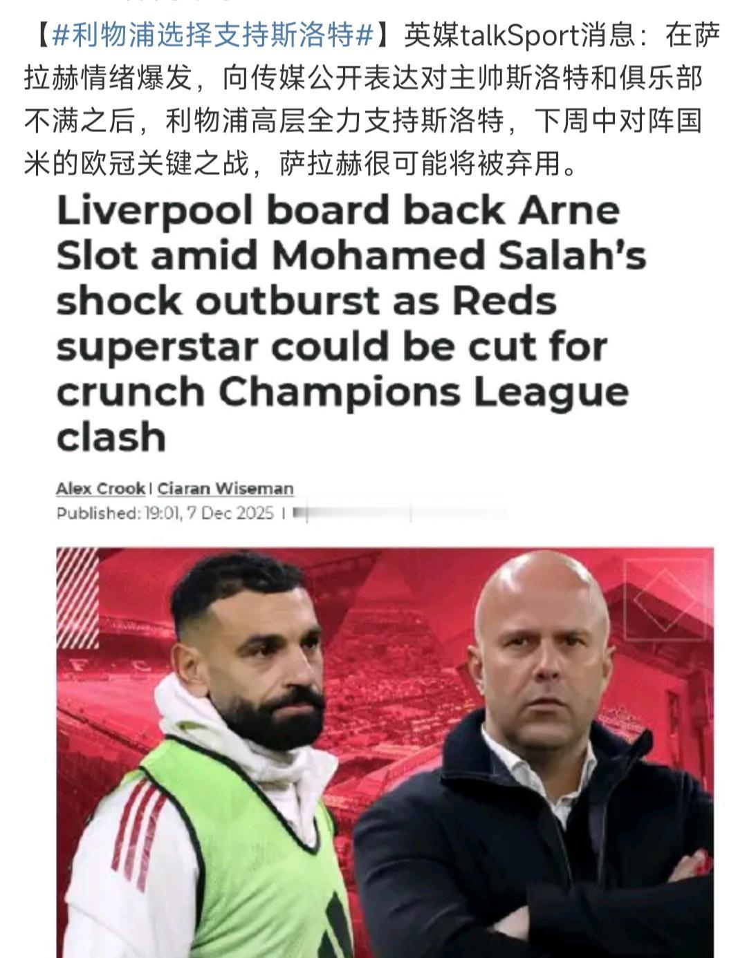利物浦选择支持斯洛特是正确的! 毕竟萨拉赫年龄在那里,不可能围绕建队。 哪怕斯洛特明年夏天下课,现在也得放弃萨拉赫了。 这是利物浦内部的重大矛盾,其他俱乐部要注意啊!!可能都会有,曼联球迷就很熟悉。[可怜]