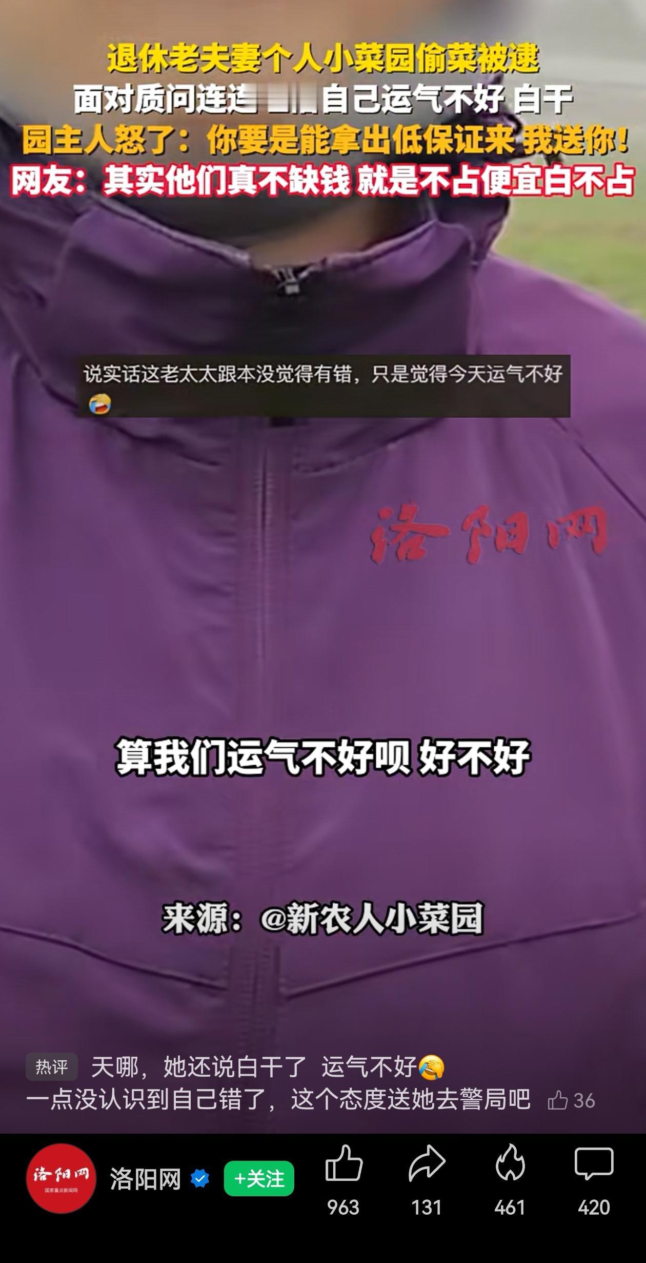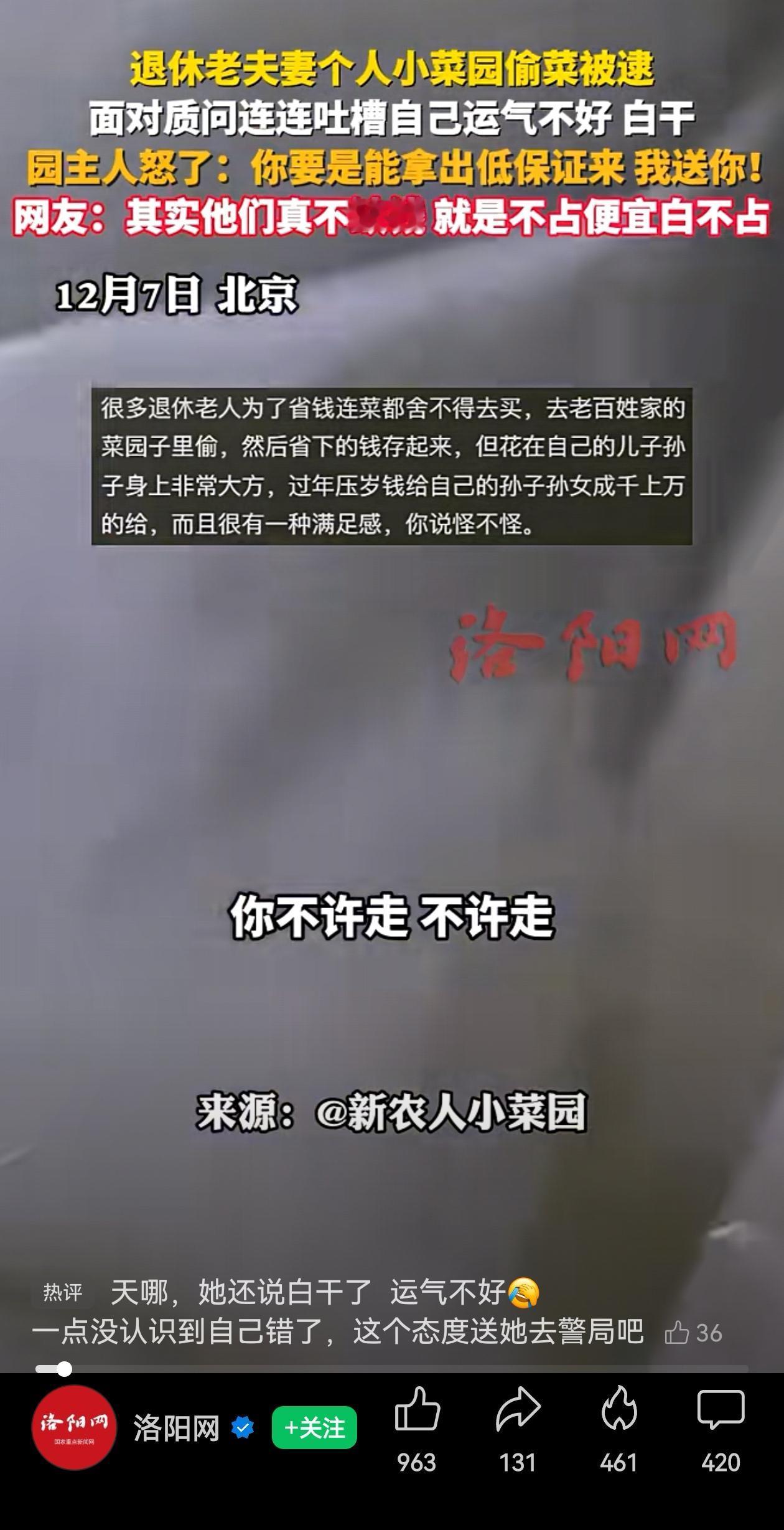 真的缺这几块钱?12月7日,北京的一个菜园园主,在自己家白菜地里,当场抓到两夫妻,把别人家菜地,当成自家菜园,不仅捡好的摘了一袋子白菜,还把菜园踩坏了。 园主看到被弄坏的菜地,看到两人穿的是某单位的制服,知道是退休职工,气愤地喊到:“为什么不去批发市场买啊?你挖坑给我载上,你看你给我破坏的!”“该花钱买花钱买呗,我不会给你多要。” 大妈说是出来遛弯,没带钱,手机转账也不会。最后大妈的回答更奇葩:“算我们运气不好呗!白干了呗!” 退休两夫妻,被当场抓住了,不付钱,一点不好意思都没有,还觉得是自己“运气不好”?心疼自己“白干了”? 园主直接怼:“拿低保证来,我送你!” 他们哪里是缺这点买菜的钱?纯粹是爱占便宜。穿着名牌冲锋衣,偷几块钱的菜,仗着岁数大,把“不拿白不拿”当成了习惯! 退休金稳稳拿着,他们缺这几块买白菜的钱吗?日子不愁,偏偏要在节约几块钱里找“成就感”吗? 被抓住脸丢大了!为了几块钱,值吗? 信息来源:洛阳网