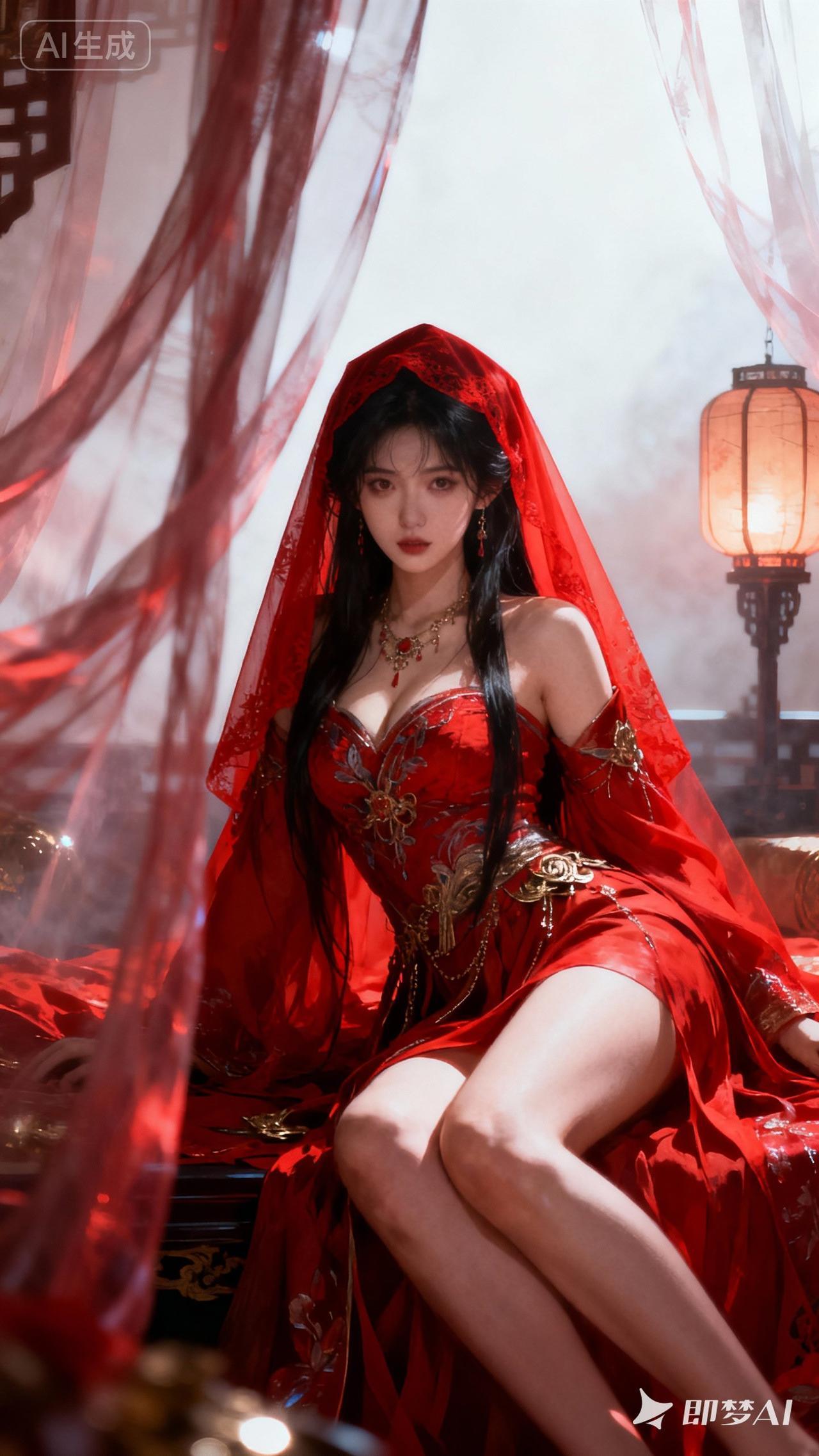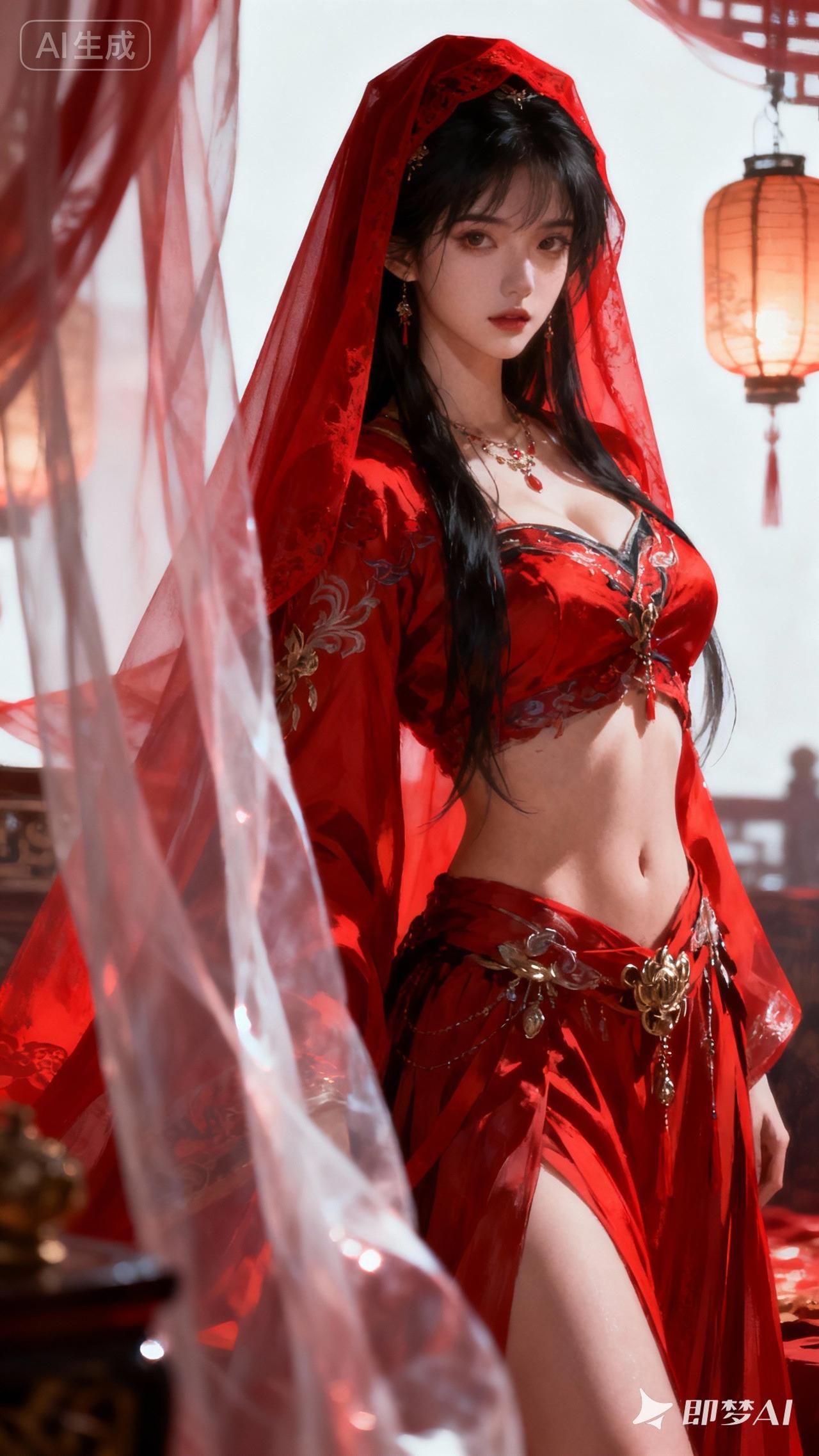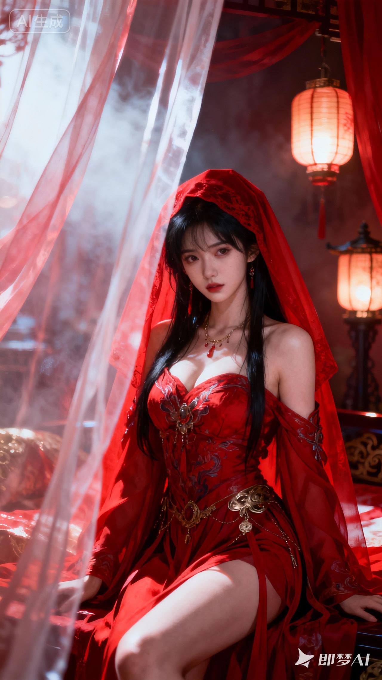 红衣美人倚纱帘,灯影摇曳夜如墨。