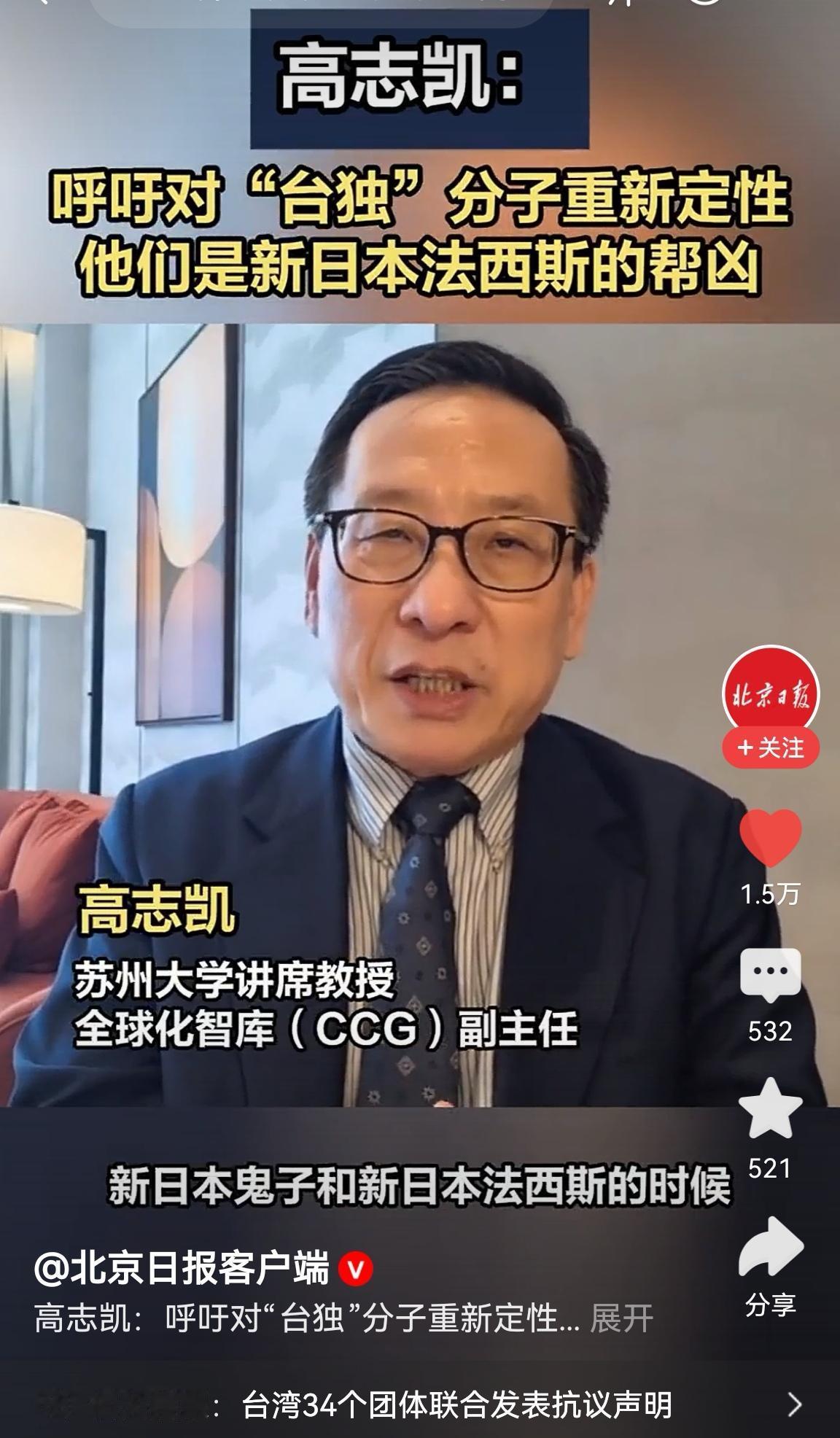 文科生天花板高志凯教授建议把“台独分子”定性为新日本法西斯的帮凶。 这个建议可以说,真是太高明,太给力了。 这样的做既可以把日本国内正在兴起的军国主义行为直接归类到法西斯的延续, 其实也等于连接把“台独分子”归类到法西斯类群中。 众所周知,法西斯是注定要被消灭的,作为二战主要战胜国,我们很高兴为世界和平再次出力。