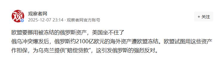 欧盟要挪用被冻结的俄罗斯资产,美国坐不住了 自2022年俄乌冲突爆发,欧盟累计冻结了俄罗斯央行约2100亿欧元资产,其中90%躺在比利时布鲁塞尔的欧洲清算银行账户里。 这些以欧元债券为主的资产,原本是俄罗斯外汇储备的“安全垫”,如今却成了欧洲烫手的山芋。 2025年,特朗普政府切断对乌直接援助后,乌克兰每月50亿美元的军费缺口压得欧盟喘不过气——波兰、捷克等前线国家喊着“用俄资打仗”,德国总理默茨更是直言“这是欧洲的责任”。 12月3日,欧盟抛出折中方案:用俄资产作担保,向乌克兰提供1050亿美元“赔偿贷款”,宣称“若俄罗斯拒绝赔款,乌方无需偿还”。 表面看,这是“以俄制俄”的聪明账,实则暗藏杀机——欧洲清算银行的法律专家私下测算,若俄罗斯未来在国际法庭胜诉,比利时可能面临千亿级索赔,而欧盟承诺的“风险共担”,至今只有一纸空文。 当欧洲急于“花钱消灾”时,华盛顿的算盘截然不同,彭博社披露,美国特使威特科夫在布鲁塞尔游说时反复强调:“这些资产是和平的钥匙,不是战争的燃料。” 特朗普的“28点和平计划”里,1000亿俄资被划进“美主导的乌重建基金”,剩余部分甚至要投入美俄联合经济项目。 这种“美国牵头、欧洲出钱”的剧本,让德国外长贝尔伯克怒批“慷他人之慨”。 更深层的博弈在金融战场,美国仅冻结了50亿俄资产,却试图主导全球3000亿俄资的分配权。 欧洲若强行动用本金,不仅可能触发欧元区信用危机,还会让美国坐收渔利——正如《华尔街日报》所言:“当欧元规则被打破,美元就是最大的受益者。” 在这场博弈中,比利时这个人口不足千万的小国成了关键卡点,欧洲清算银行的总部大楼里,存放着俄央行1940亿欧元的债券,每一张都可能成为未来的“起诉书”。 比利时首相德韦弗苦口婆心:“如果欧盟认定这是合法行为,为什么不敢签一份共同担保协议?”他的担忧绝非杞人忧天——俄罗斯已列出反制清单:境内2300亿欧美企业资产可能被国有化,匈牙利、斯洛伐克60%的过境天然气将被切断。 更现实的是,比利时从冻结资产中获得的数亿欧元利息,早已用于援乌,如今若动用本金,布鲁塞尔金融中心的信誉将崩塌。 国际清算银行数据显示,2025年已有12家央行将欧元储备转移至新加坡,理由是“主权资产不安全”。 这种“前人吃肉、后人喝汤”的局面,让比利时外长普雷沃怒斥:“这是最差的方案!” 莫斯科的反应堪称激烈,梅德韦杰夫直言:“挪用资产等同于宣战,我们将以实物索偿。”这话不是空谈——2024年,俄罗斯已将西方在俄能源资产纳入“特别管理清单”,一旦欧盟越界,这些价值千亿的资产将被直接没收。 更狠的是能源牌:2025年冬季,俄罗斯已削减对斯洛伐克70%的天然气供应,警告“下一个就是比利时”。 国际法层面,俄罗斯的“盗窃”指控直击要害,二战后,即使对日本也未没收央行资产,如今欧盟自创的“赔偿贷款”模式,被海牙国际法院顾问称为“金融海盗行为”。 一旦判决不利,欧盟可能面临史上最大规模国家赔偿,而比利时作为资产托管国,首当其冲。 这场千亿资产的争夺战,撕开了西方阵营的三大裂痕: **战略分歧**:美国要“以资产促和谈”,欧洲要“以资产续战争”,乌克兰夹在中间——2025年底的迈阿密会谈中,乌方代表乌梅罗夫被迫接受“割地换和平”的草案,只因欧盟的资金承诺是“最后一根稻草”。 **金融信任**:当“主权资产不可侵犯”的铁律被打破,全球去美元化加速——2025年,印度、巴西合计减持1200亿美欧债券,转投黄金和人民币。国际货币基金组织警告:“这可能是布雷顿森林体系瓦解以来最大的金融地震。” **阵营分化**:匈牙利、奥地利公开反对动武,波兰、波罗的海三国喊着“立刻没收”,法德在“战略自主”与“美国压力”间摇摆。 12月7日,英国突然宣布将80亿英镑俄资直接移交乌克兰,彻底撕开美欧表面的团结。 截至2025年12月中旬,欧盟峰会的延期已达三次,冯德莱恩的缩水方案仍未说服比利时,而乌克兰的财政赤字正以每天1.2亿美元的速度膨胀。 更严峻的是,美国已给欧洲下了“2027年防务大限”——要么独立承担北约常规防务,要么失去情报支持。这种“要钱又要命”的施压,让欧洲陷入更深的焦虑。 莫斯科的时钟也在滴答作响,2025年12月8日,俄罗斯央行宣布黄金储备突破2000吨,外汇储备回升至6316亿美元,“抗制裁能力比2022年更强”。 而欧洲的天然气库存仅够维持45天,工业产出连续18个月下滑。当冯德莱恩在布鲁塞尔喊着“团结”时,柏林街头的抗议者举着标语:“用俄资?先赔我们的暖气费!” 这场博弈没有赢家,欧盟若妥协,乌克兰可能在2026年崩盘;若硬扛,欧元信誉、欧洲团结、甚至战后秩序都将成为祭品。而美国,正隔着大西洋,等待收割残局。