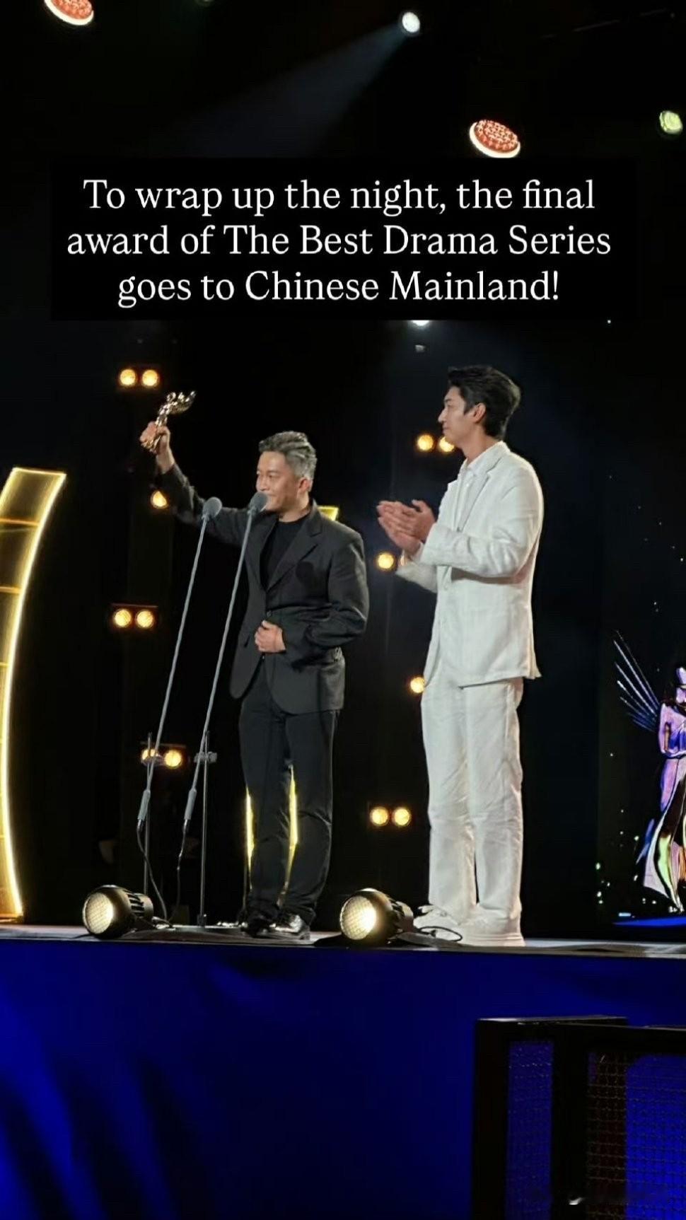 杨旭文差点说成产品了 《唐朝诡事录》以0.06分险胜《苦尽甘来遇见你》,在亚洲影艺创意大奖(AACA)上,《唐朝诡事录之西行》斩获“最佳剧集”奖,同时还获得“最佳摄影”奖! 杨志刚机智的说:英语都无法表示我此刻的心情,我只能说母语了,其实是英语都还给老师了。 杨旭文也在边上说谢谢大家喜欢我们的产品,立马改成作品。