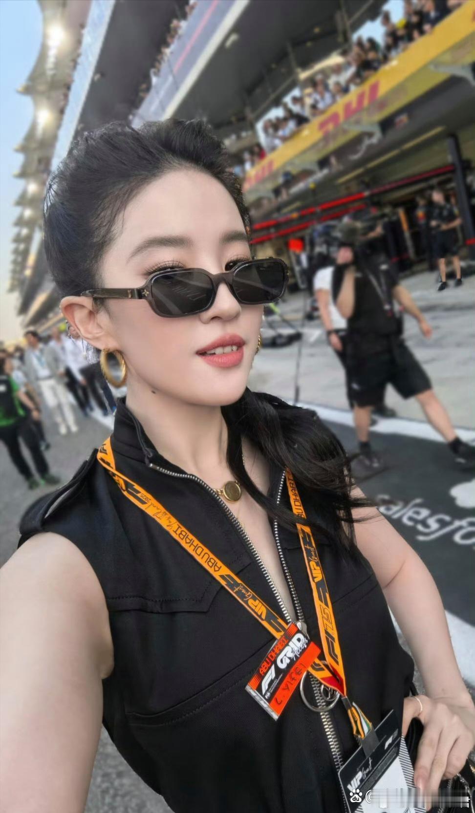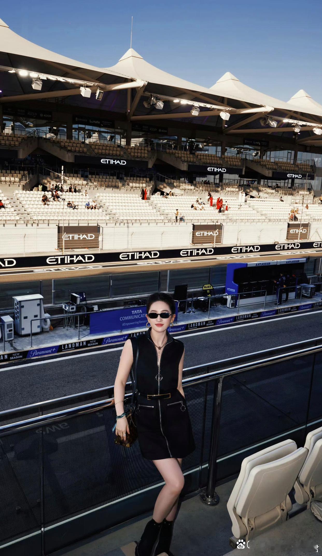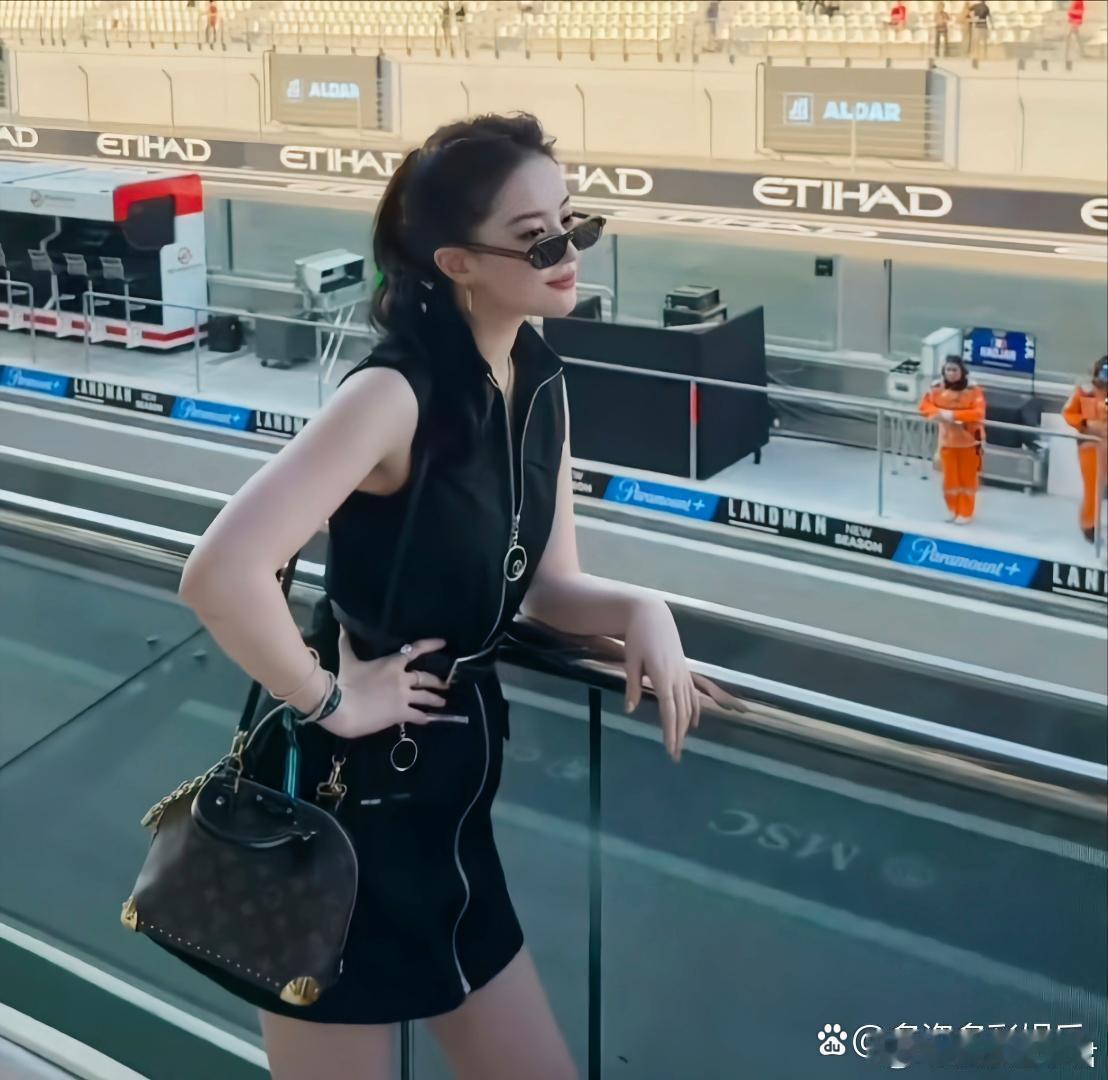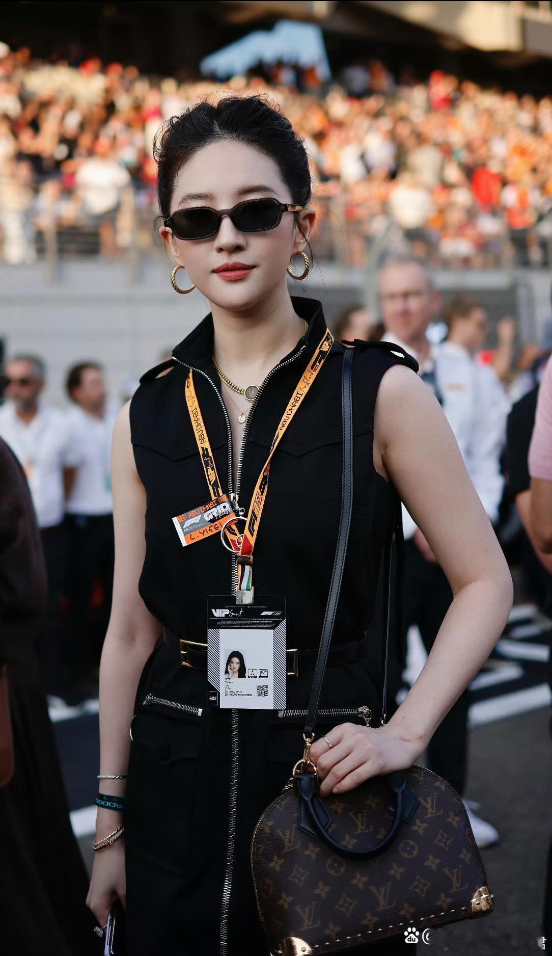 刘亦菲阿布扎比观赛F1她戴着墨镜穿着黑色连衣短裙,梳着长马尾,气质超好,自信又明媚,如女王降临人间!