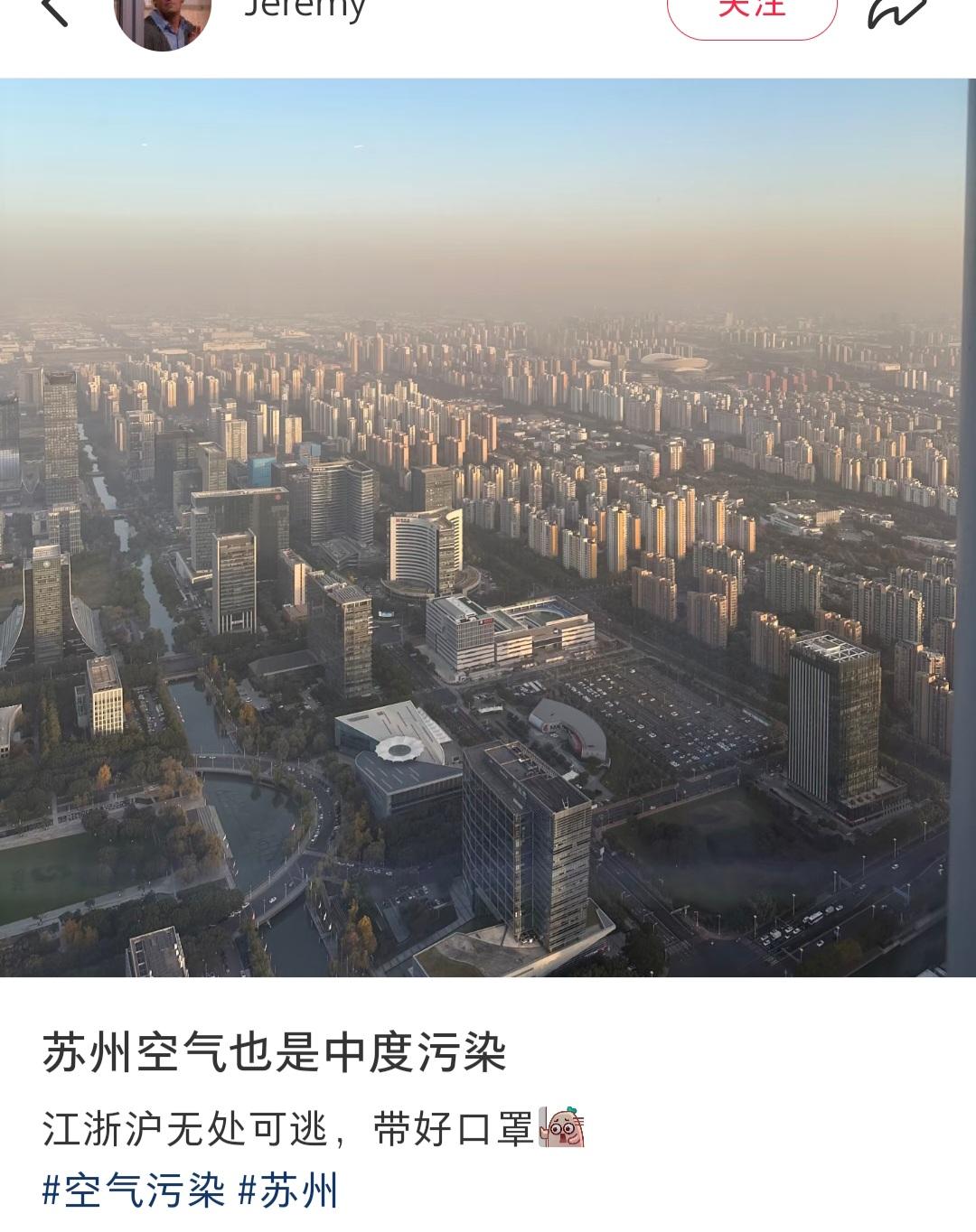 一出上海,到苏州就天空全灰了,像哭过。 北京早已树木凋零,我和老婆去上海南京看枝叶繁盛梧桐树路与体验最后秋色感。12月3日到上海,5日下午乘高铁去南京。一出上海,到苏州就天空全灰了且无云,而上海那边天空有蓝色与白云。见图1,左边为上海,右面是苏州。 搜天气预报,苏州当天空气质量良,明后天轻度雾霾。 其实良也是轻度雾霾,但实际表现不同。像今天同样的良,上海略显雾霾但可见浅显蓝天白云,而苏州全灰而没有蓝天白云。 11月份网上不断曝出上海出现雾霾,近日我看网上苏州继上海后因雾霾被很多人吐槽。 我去过苏州几次,有好印象也有坏印象。 好印象:一是老城区整体保护很好,古色古香,全国少见,这个像北京。古城现存全国重点文物保护单位十三处、省级文保单位五十七处、市级文保单位一百七十八处,涵盖拙政园、留园等9座世界文化遗产园林,拥有二百五十处控制保护建筑群落。1986年设立全国首个国家历史文化名城保护区。 二是美食多,如松鼠桂鱼,一吃就感到是新鲜现做且手艺专业。 坏印象:一是整个城市布局设计存在严重问题,违背古今中外的天人合一的城市美学,在老城区四周盖滿了几十层高的千楼一面简陋难看的密集住宅,像巨墙把苏州城围起来,遮天蔽日。看起来又像一口大锅,姑苏城沉陷于祸底。 二是雾霾厉害,我去苏州几次,天空就都是灰沉沉的,没见过透彻的蓝天。 有人怪苏州上海雾霾变严重和北方及沙尘暴有关系。我看这可能有关系,但一年中经常碰到雾霾,就不能怪北方及沙尘暴了。是否与苏锡常上海一体化经济模式有关,这是中国最大工厂区。 各位有啥看法?@真业心学创始人东方赢 欢迎评论。