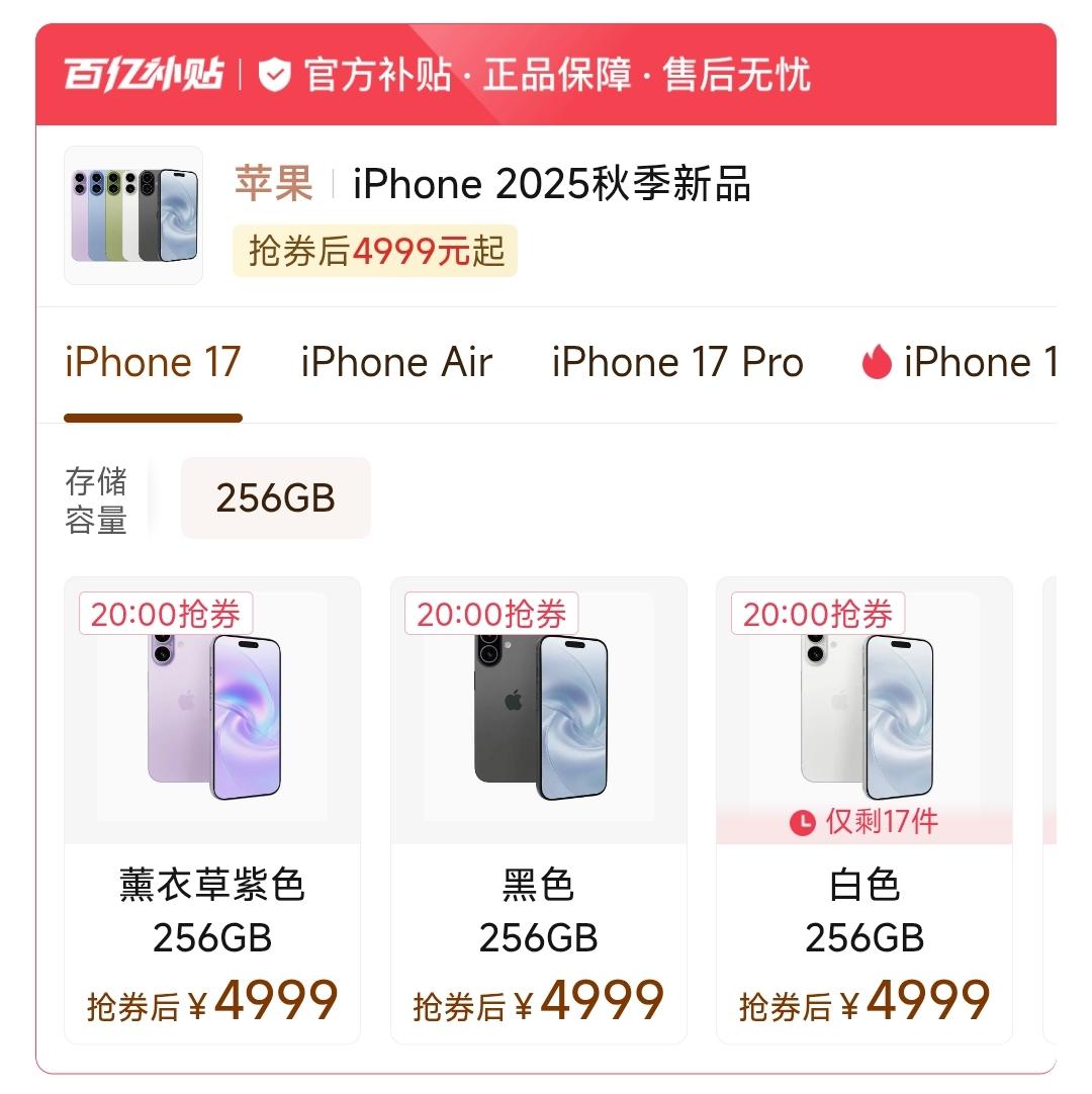 iPhone 17,4999元,比上市的时候便宜了1千。 拼多多百亿补贴,256G的版本,这个价格值不值得入手? 现在小米15 Ultra,只要4289元,女孩子用,哪个更合适? 拍照肯定是小米15 Ultra强,但是很多人都说小米手机不值这个价。 苹果17又觉得屏幕小了点,有谁懂啊!