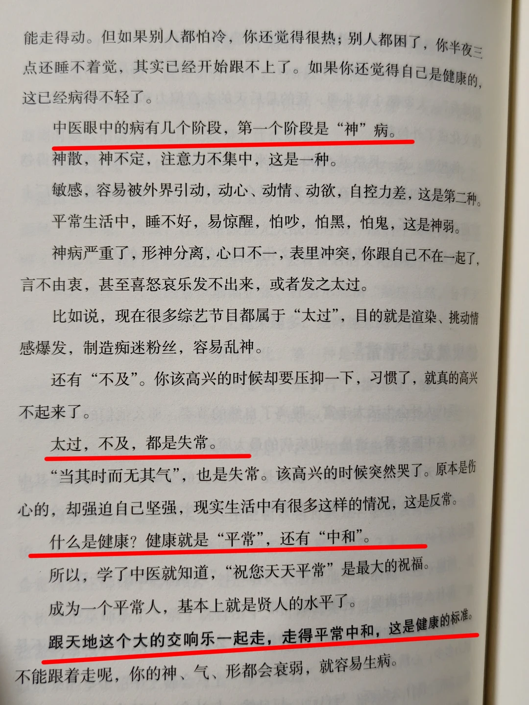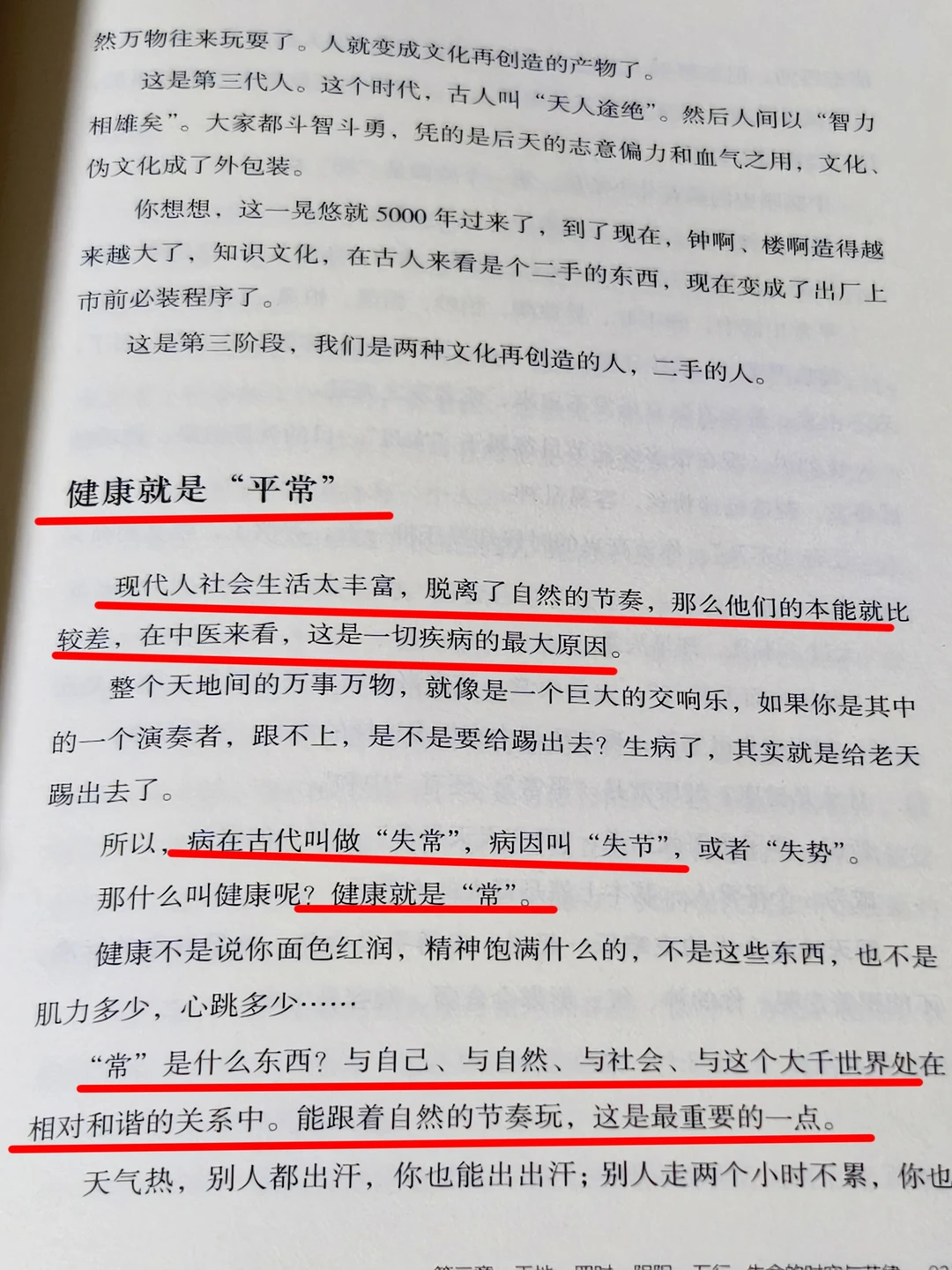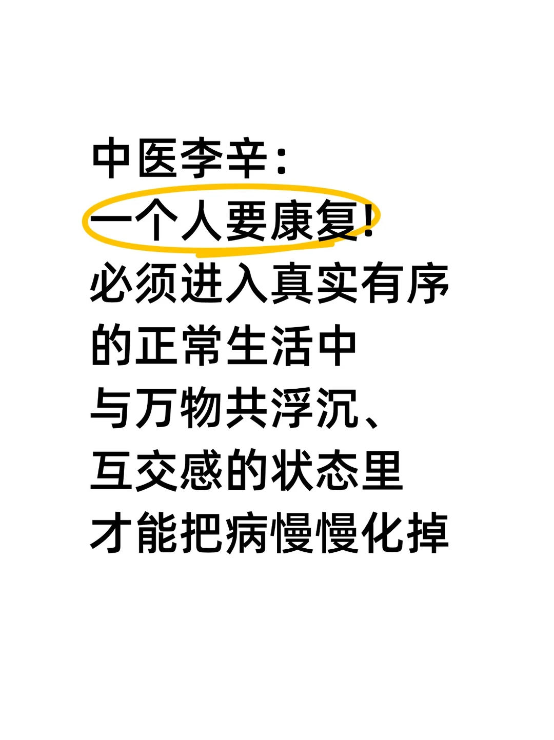 现在有一个很大的误区:有病就要根治,不停地治,一直治下去。因此,病人甚至整个家庭会完全忘记正常的生活,没有运动,没有生活,没有娱乐,没有恋爱,什么都没有,只剩下整天紧张、焦虑地跟病魔作斗争。 · 重点不是去治病,而是让生命的基本面维持在一个比较好的状态。 · 健康就是平常,让自己跟着大自然的节奏走,多跟真实的世界接触。