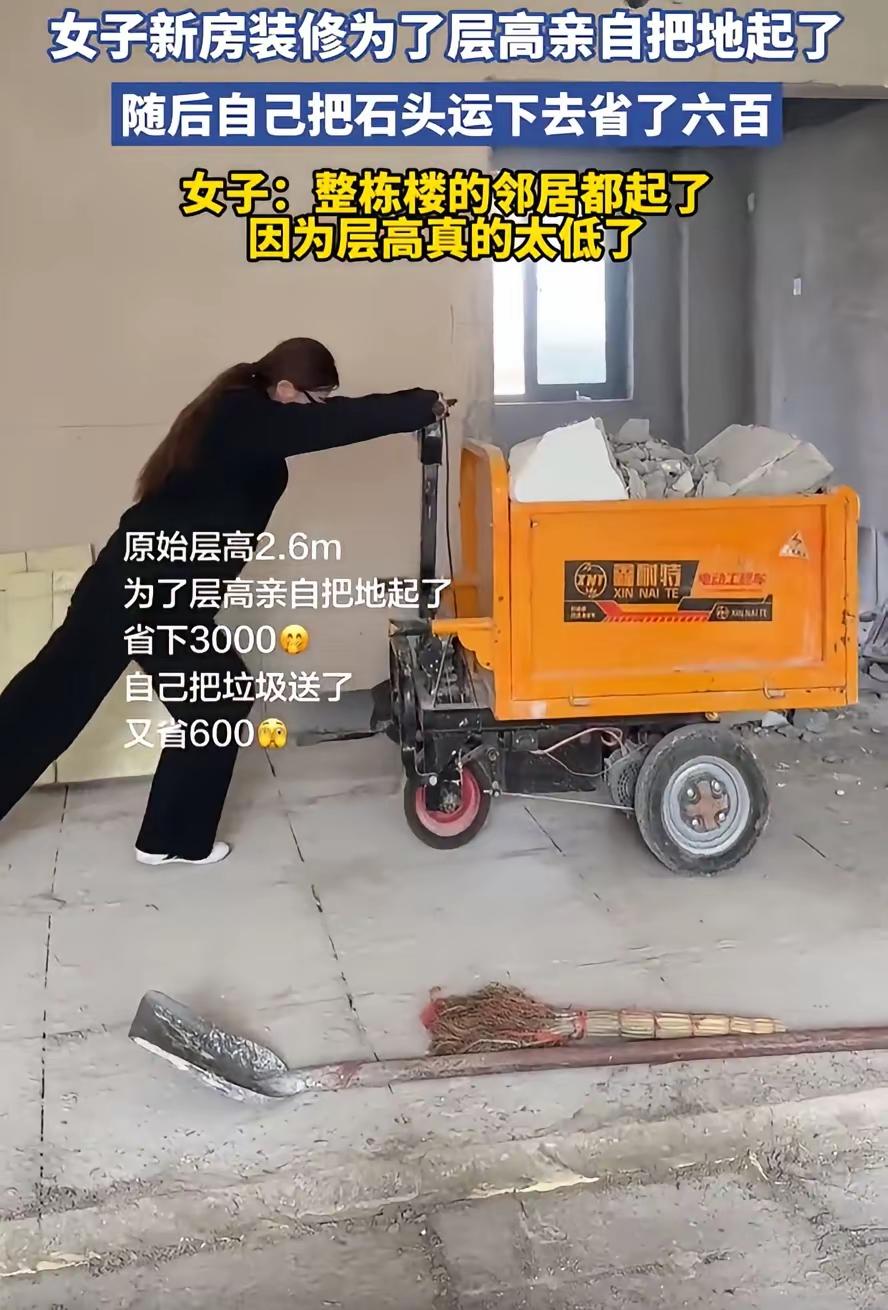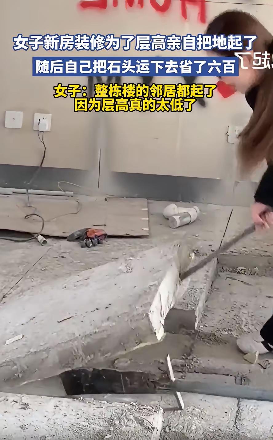 “为了层高也是拼了!”广东,一女子装修新房,她嫌房子2.6米的层高太矮了,亲自动手把地面铺设的十公分厚的水泥板撬起来,一来一回省下了几千块,但在不少人看来,这么做却非常自私 业主是位女士,拿到新房钥匙后,越看越别扭。2.6米的层高,站在屋里总觉得压抑,抬手都像要碰到天花板,心里堵得慌。 她瞧着同栋楼不少邻居,都把地面的水泥层给敲了,说是能增加一点空间,便也动了心思。找师傅询价,开口就要三千块,还不算垃圾清运费,她当即就打消了念头。 “自己动手,丰衣足食”,她借来撬棍、锤子,蹲在地上一点点凿。十公分厚的水泥板,硬邦邦的,敲一下震得手麻,搬一块累得腰直不起来,前前后后忙了两天才完工。 废料也没花钱请人,她分批次扛下楼,一趟趟跑,汗浸湿了好几件衣服,最后算下来,省了三千多工钱,还少花六百块清运费,心里别提多得意。 她把撬水泥的过程拍下来发上网,本想晒一晒自己的能干和省钱本事,没成想评论区直接炸了锅,全是反对的声音。 有网友直言:这哪是省钱,这是给邻里添堵。开发商铺这层水泥,不只是找平,核心是隔音,你敲掉了,自己住得敞亮了,楼下邻居就得遭罪。 以后在家走路、拖椅子、掉个杯子,声音都能清清楚楚传到楼下,白天还好,夜里稍微有点动静,楼下都没法安睡,长期下来,邻里矛盾迟早要爆发。 其实这事说简单也简单,说复杂也复杂。业主想省点钱、让家住得舒服些,无可厚非;楼下邻居想安安静静过日子,也合情合理。 可做人做事,不能只盯着自己的一亩三分地。装修从来不是自家的私事,隔音、承重这些事,牵一发而动全身,拆之前多考虑考虑别人,不是吃亏,是体面。 省下三千块,换来了邻里间的隔阂,甚至可能影响房屋安全,这笔账,怎么算都不划算。住楼房,讲究的是互相体谅,只顾自己舒服,迟早要栽跟头。