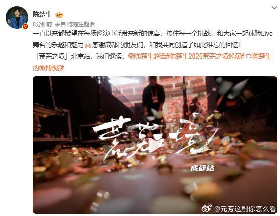 陈楚生希望在每场巡演中能带来新的惊喜陈楚生感谢成都的朋友们陈楚生巡演坚持每场焕新!成都站携弦乐、摇滚多元歌单,虚拟与现实交织的现场,致谢歌迷一路同行。