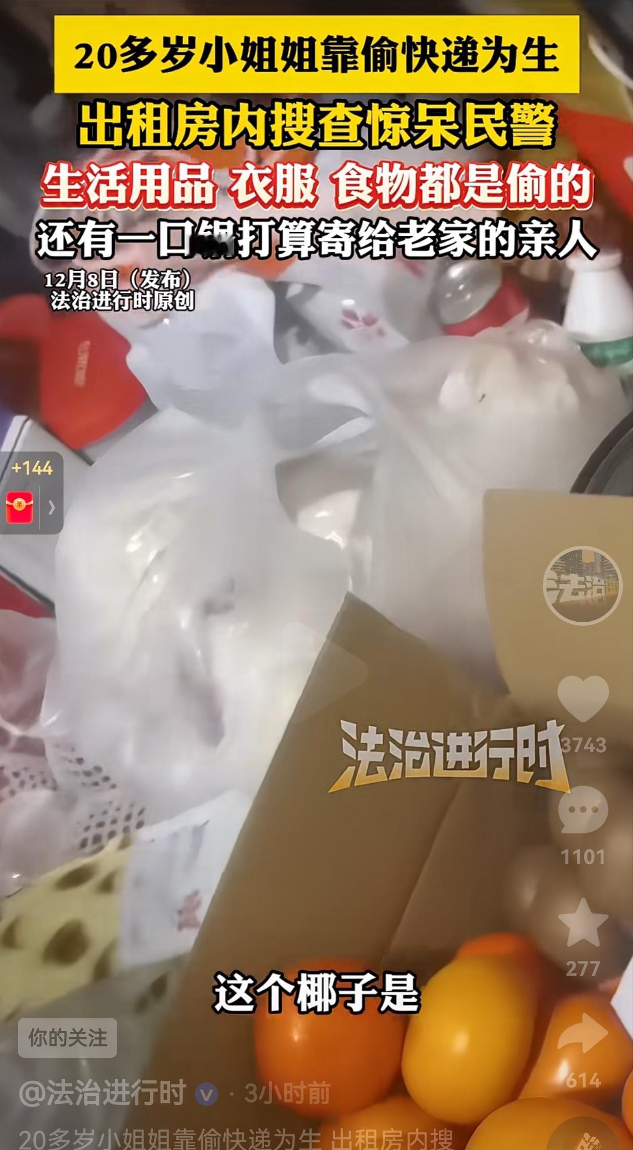 真是狠人呐!能把日子过成这个样子,也是没谁了!20多岁的小姑娘太懒了,吃不了生活的苦,也不愿意上班,没有收入来源怎么生活呢? 思来想去,她就想到了一个点子那就是偷快递,起初她只是抱着侥幸的心理,看一看有没有人发现她的所作所为。你还别说,没人有找上门,因此一次又一次得得逞,让她变得肆无忌惮了起来。 后来,她甚至把偷快递当成自己的工作,家里缺什么,她就偷什么。 等警方锁定她的时候,来到她的出租屋搜查的时候,真的是惊呆了民警。无论是生活用品,还是衣服、食物等,都是偷的。 令人无语的是,当民警提及没有拆开的一口锅时,女生竟然说,自己打算把这口锅寄给老家的亲人。 这个姑娘的行为,既是“懒”的纵容,更是对法律和他人权益的漠视。她把“偷”当成生活方式,说白了就是用侥幸透支自己的人生。 首先,“吃不了上班的苦,就得受违法的罪”:她把“懒得工作”当成偷的借口,但成年人的生活从没有“不劳而获”的捷径,偷来的便利,早晚会用自由和名誉偿还。 其次,把偷来的锅寄给亲人更扎心,她以为这样做是给家人的心意,实则是把违法的污点带进了关心里,这份“礼物”不仅一点也不体面,还会让亲人跟着蒙羞。 最后,这事儿也提醒我们所有的人,生活的苦或许难扛,但走歪路的代价更重。与其靠偷拼凑日子,不如哪怕从一份基础的工作做起,至少挣的每一分钱,都能站在阳光下。花的也更有底气。 大家觉得呢?欢迎大家评论区讨论留言。