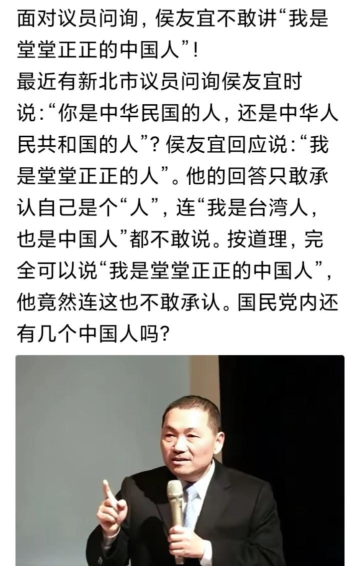 侯友宜代表了很大一部分国民党官僚:打死不承认是中国人, 哪怕中华民国人也不行,中华民族也不行,中国台湾人也不行,中华民国台湾人也不行 国民党现在就是谈中色变,问题是,只敢承认自己是人,但民进党还是该打压打压,如此的畏畏缩缩,如此的没有担当,谁又能信得过你呢?