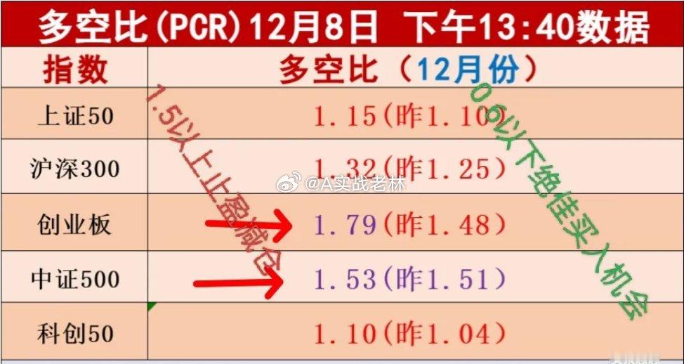 12.8创业板指数多空比目前到了1.5以上,达到1.79,涨幅过猛,按照1.5以上指标是分期止盈减仓机会,今天创业板指数是止盈减仓机会,包括创业板50等相关指数,重仓适当分期止盈减仓,不要清仓,也许卖飞,这个数据从经验分析,停留时间不会多,1--3天。 以上观点仅供参考不构成投资依据,自负盈亏。
