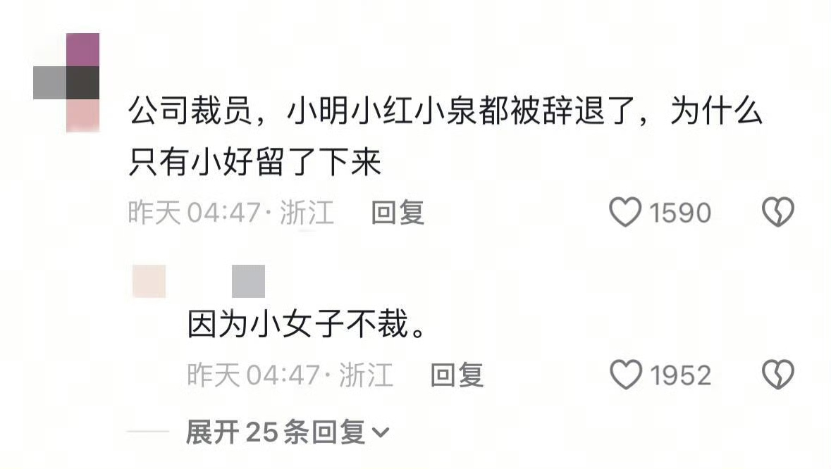 公司裁员,小明小红小泉都被辞退了,为什么只有小好留了下来 因为小女子不裁。