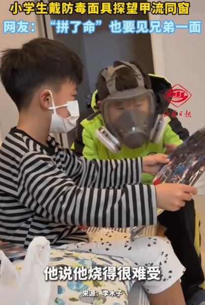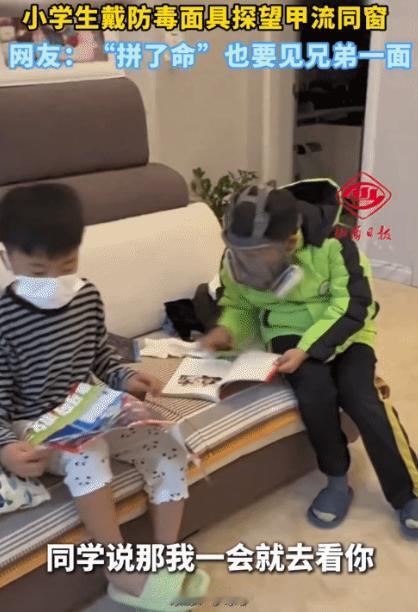 “笑不活了!”小男孩感染甲流,没去学校,想同学。没想到,他同学戴着防毒面具来找他玩,给他带了一本书、药和水果。 然而这个看似滑稽的场景,背后是两个孩子之间最纯粹的友谊。 小男孩感染甲流已经第三天了。 体温一直徘徊在38.5度,而且额头滚烫,整个人蔫蔫地躺在床上。 妈妈刚给他换了额头的毛巾,手机“叮”的一声响了。 是小男孩的同学发来的消息:“今天怎么没来学校?” 小男孩吃力地打字回复:“发烧了,难受……有点想你。” 这句话带着孩子气的委屈。 独生子女在家生病,连个说话的人都没有。 而这大的孩子正是爱玩闹的年纪。 他同学说,我马上过去找你玩。 小男孩的妈妈看到对话,赶紧拿过手机语音劝说:“他得的是甲流,会传染的,你别来了。” 而且甲流可不是普通感冒,学校都建议停课一周在家隔离。 谁知小男孩马上回复:“阿姨放心,我戴着面具来,保证传染不上!” 当时妈妈只当孩子开玩笑,没放在心上。 然而谁知二十分钟后,门铃真的响了。 开门一瞬间,男孩儿的妈妈忍不住笑出声。 只见他同学戴着一个大大的防毒面具,几乎把整个脸都罩住了,只露出两只亮晶晶的眼睛。 而且他手里拎着个塑料袋,装得鼓鼓囊囊。 “阿姨,我看他来了!”面具后的声音闷闷的,却透着兴奋。 最神奇的是,原本无精打采的男孩儿,一见到好朋友这身装扮,立刻从床上坐了起来,眼睛都亮了。 “你这装备也太夸张了吧!”男孩笑得咳嗽起来。 此时他同学得意地拍拍面具:“这是我爸仓库里的专业装备,病毒绝对进不来!” 之后两个孩子凑在一起,很快就聊得热火朝天。 虽然这防毒面具虽然看起来滑稽,但是却成了保护友谊的铠甲。 而同学带来的塑料袋里装着三样东西,每样都很有讲究。 一本《海底两万里》的彩色插图版,是给小男孩儿解闷的。 他知道好朋友最爱海洋故事。 还有一盒儿童感冒药,是来之前特意让妈妈去药店买的。 他记得男孩儿说过某种药效果特别好。 还有几个新鲜的苹果和橘子,是他从自家水果篮里精心挑选的。“ 生病了要多补充维生素。”他模仿着妈妈的语气说。 最让人感动的是,同学还带来了一本课堂笔记。 上面工整地记录着当天各科的重点内容,还用彩色笔画了几个搞笑的表情包。 “等你好了,我帮你补课!”他拍着胸脯保证。 这份友谊不是突然形成的。 两个孩子是同班同学,还是校篮球队的队友。 每天一起上课、训练,建立了深厚的“革命友谊”。 男孩儿的妈妈后来回忆,有一次比赛孩子扭伤脚踝,是他一路搀着他去医务室。 还有次孩子忘带午饭,也是他分给他一半妈妈做的红烧肉。 童年的友谊往往建立在无数这样的小事上。 它不像成年人交友那么多考量,更多是纯粹的性情相投。 “我们就喜欢在一起玩。”问及为什么关系这么好,同学曾这样简单总结。 防毒面具虽然看起来夸张,却体现了他的细心。 他知道甲流会通过飞沫传播,普通口罩可能不够保险。 而且这个面具是他爸爸工厂里用的专业防护装备,过滤效果比普通口罩强很多。 他来之前还特意请教了爸爸正确佩戴方法。 虽然防毒面具虽然遮住了笑脸,但是却掩藏不住那颗真诚的心。 “我要保护好自己,才能经常来看你啊。 而这种既重情义又讲究科学的做法,让大人都自愧不如。 同学的妈妈后来表示,她很支持儿子的做法:“既珍惜友谊,又懂得保护自己。” 而这个故事最打动人的,是孩子们处理问题的直接和纯粹。 成年人遇到这种情况,可能会犹豫再三:会不会打扰对方休息?会不会被传染?要不要带礼物?带什么礼物合适? 在一系列考量后,可能就变成简单的“多喝水,好好休息”微信问候。 但孩子不这样。 他想念朋友,就直接表达,想见面,就想办法实现。 而防毒面具这个解决方案虽然看似滑稽,却饱含童真的智慧。 “我想见你,所以我来了”,就这么简单。 主要信源:(这哥们能处!男孩患甲流没去学校,同学戴“防毒面具”上门探望——澎湃新闻)