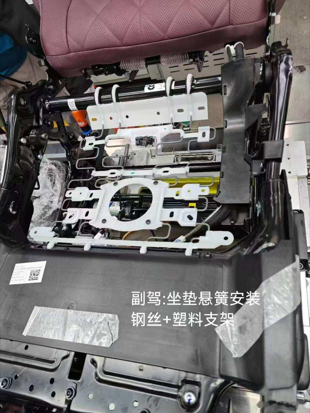 蔚来全新ES8靠背和坐垫都有对应的悬簧来增强支撑,也就是大家所说的弹簧。靠背的悬簧做了分区域的设计来提高舒适性,外面额外增加了毛毡板来防止异响和提升承托均匀性,也是因为毛毡,悬簧被遮进去了,实际悬簧的样子如下面的数据图。坐垫上也有悬簧,且增加了包塑来增加刚性和减少异响。换句话说:以前最垃圾的靠背悬簧,不带任何调节功能,三根折弯钢丝,现在蔚来都是4向气动腰托。说蔚来没弹簧的可以休止了!