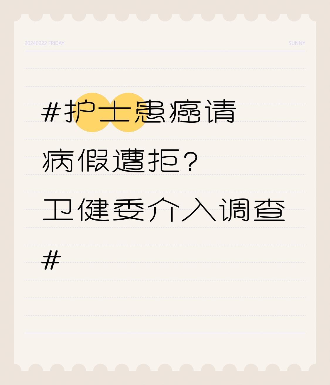 护士患癌请病假遭拒?卫健委介入调查 护士患癌请病假遭拒这事真让人义愤填膺!网友“拓河秋树”(女护士丈夫)发的视频获赞超21万。视频里女护士哭诉,自己在丰城中医院干了5年,查出肺癌,拿着盖公章的病假条却请不了病假,领导只给开事假。她之前高强度上班,上俩月班还得上一个月夜班,结果累出病。 医院工作人员称她只讲了部分情况,但不管怎样,患癌这么严重的病,医院还如此不通情达理,实在让人寒心。目前丰城市卫健委和相关部门已介入调查,希望能给出一个公正合理的结果,让患病的护士能安心治病。