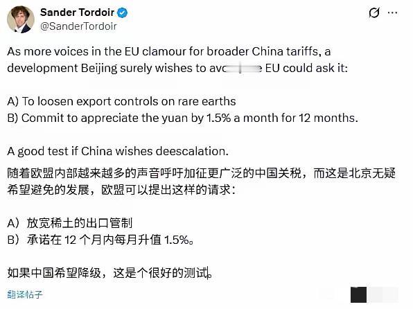 不仅欧洲政客天真,连欧洲的精英都还活在幻想里,欧洲经济学家称中国必须答应欧洲两个条件,一个就是放宽稀土出口管制,一个是连续12个月人民币升值,每个月升值1.5%,要不然就要面对欧洲的加征关税,然后这个欧洲经济学家还幻想中国一定不希望升级,所以只要欧洲虚空造牌,威胁要加征关税,我们就会答应欧洲这两个条件,就这样凭空让中国退让了! 欧洲整体上已没有什么竞争力了,再怎么保护折腾也无用。自由贸易,本质上是欧美经济强国一经济手段收割全世界,现在,经济成本上打不过后进的经济强国中国 所以,欧美要把国门关上一些,保护自己的企业。人民币肯定会升值,但是不可能幅度这么大,肯定也会放宽稀土出口,条件是欧洲取消对中国产品限制 然后中国一克稀土都不给欧洲,加关税够欧洲自己物价飞涨,没了廉价的俄罗斯能源,没了中国廉价的工业品,没了稀土,欧洲还能干啥?