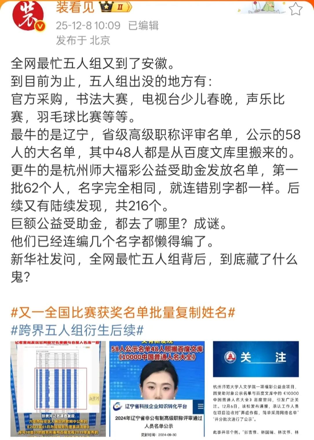 “最忙五人组”事件,不仅是歪风邪气,不仅败坏社会风气,而且涉嫌诈骗犯罪,建议刑事立案调查,严肃查处严厉打击。