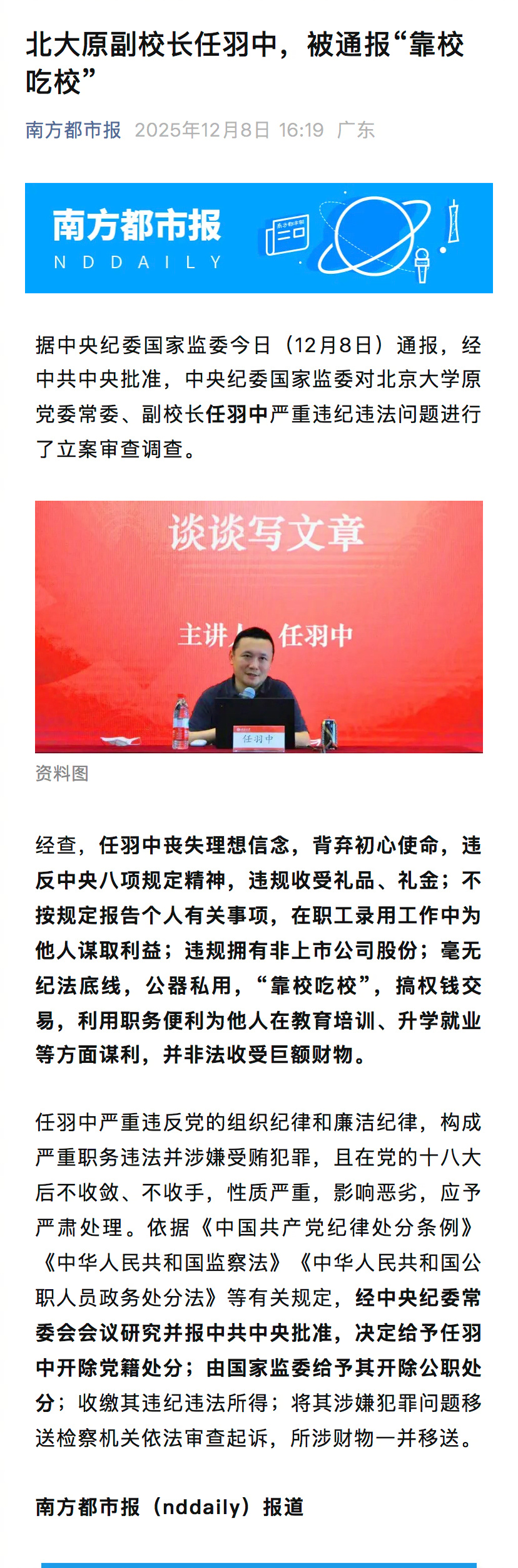 【#北大原副校长任羽中被通报靠校吃校#】北大原副校长任羽中,被通报“靠校吃校”】据中央纪委国家监委今日(12月8日)通报,经中共中央批准,中央纪委国家监委对北京大学原党委常委、副校长任羽中严重违纪违法问题进行了立案审查调查。经查,任羽中丧失理想信念,背弃初心使命,违反中央八项规定精神,违规收受礼品、礼金;不按规定报告个人有关事项,在职工录用工作中为他人谋取利益;违规拥有非上市公司股份;毫无纪法底线,公器私用,“靠校吃校”,搞权钱交易,利用职务便利为他人在教育培训、升学就业等方面谋利,并非法收受巨额财物。任羽中严重违反党的组织纪律和廉洁纪律,构成严重职务违法并涉嫌受贿犯罪,且在党的十八大后不收敛、不收手,性质严重,影响恶劣,应予严肃处理。依据《中国共产党纪律处分条例》《中华人民共和国监察法》《中华人民共和国公职人员政务处分法》等有关规定,经中央纪委常委会会议研究并报中共中央批准,决定给予任羽中开除党籍处分;由国家监委给予其开除公职处分;收缴其违纪违法所得;将其涉嫌犯罪问题移送检察机关依法审查起诉,所涉财物一并移送。