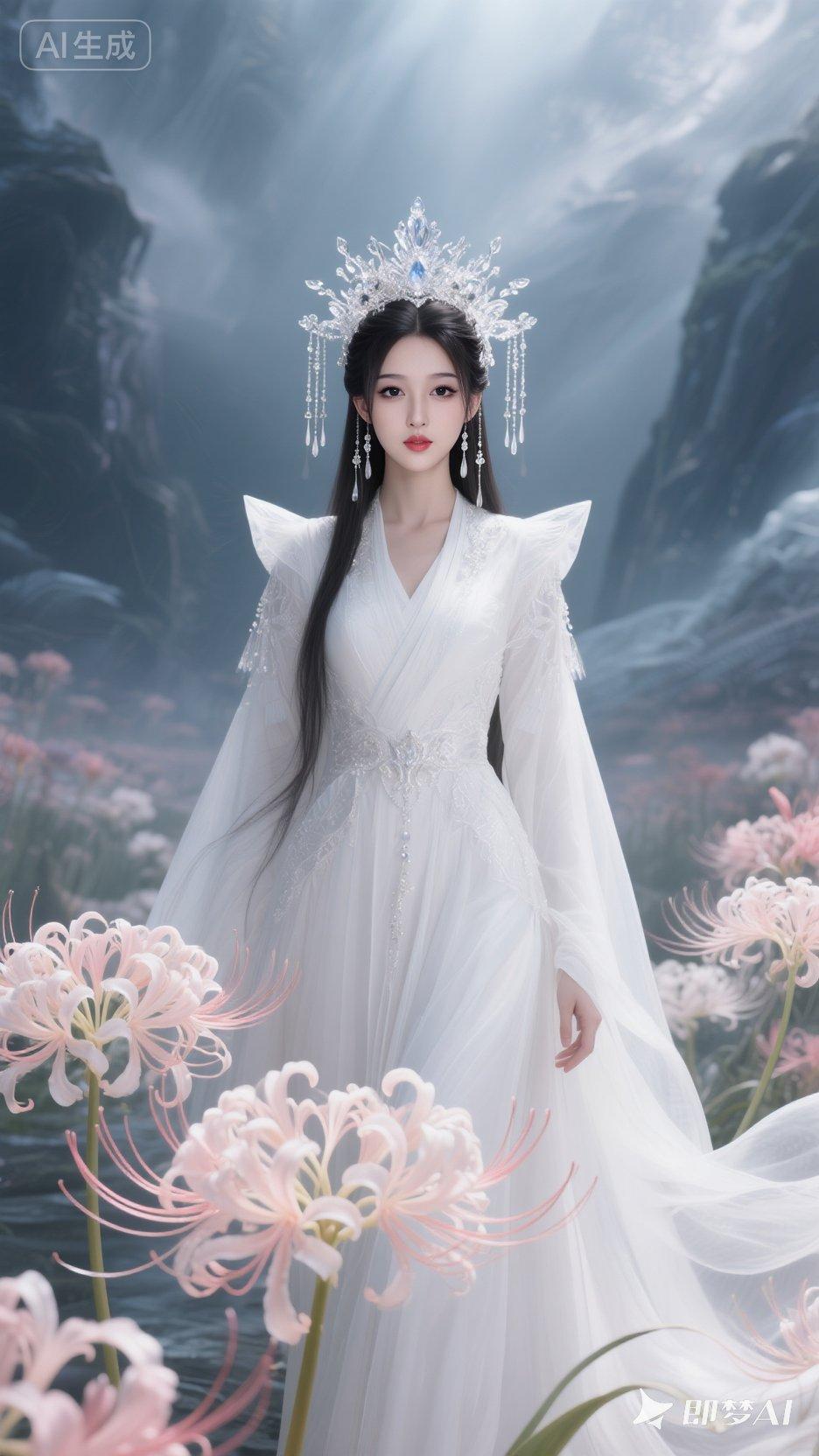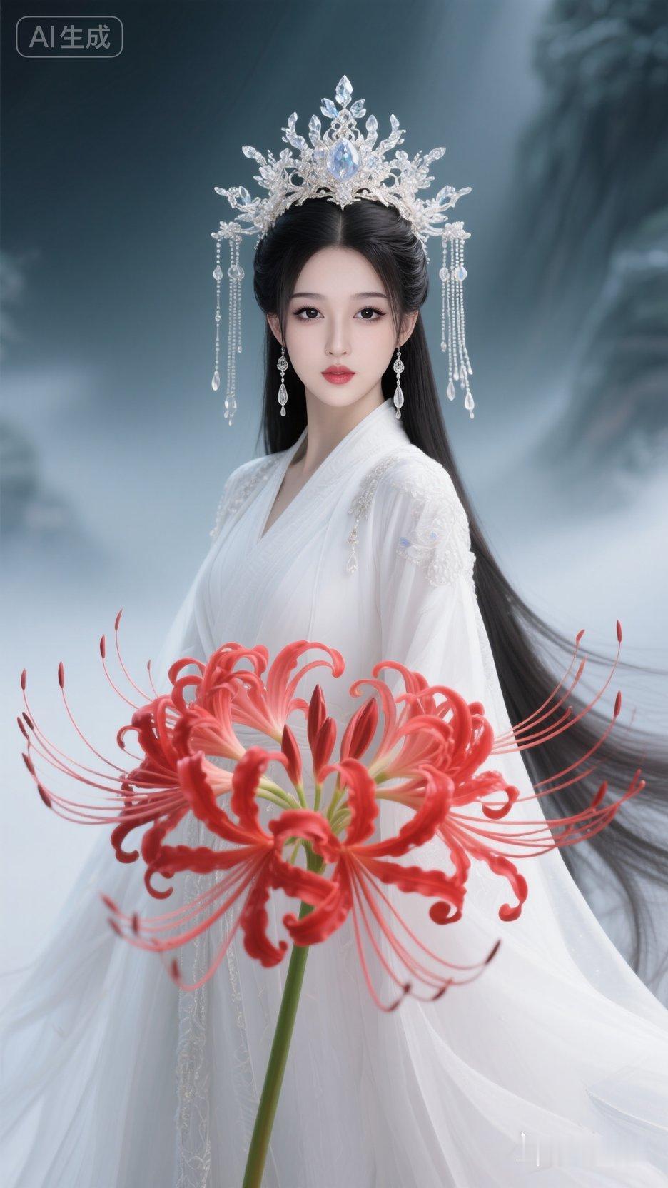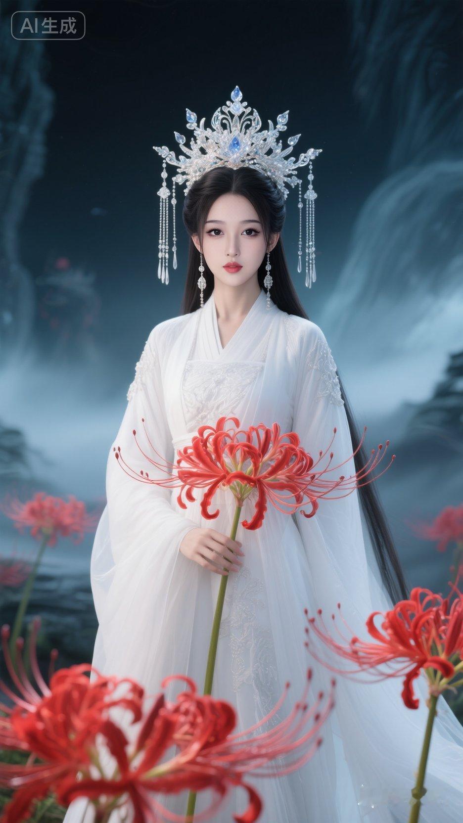 红色彼岸花曼陀沙华,纯白色服装设计,立体的彼岸花盛开,五官立体精致,谪仙清冷,温润如玉,长发绝美的仙子,水晶冠,华丽的流苏,古风