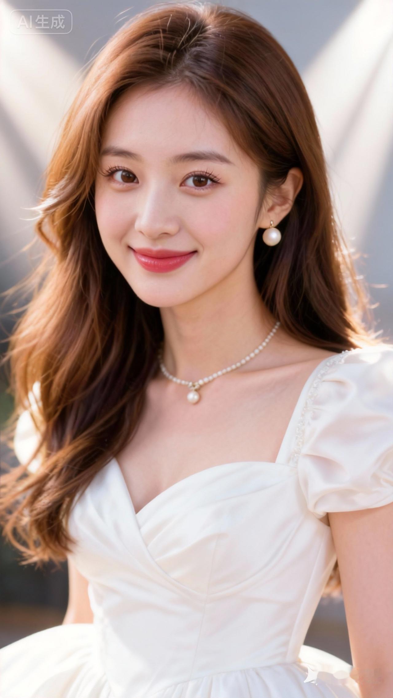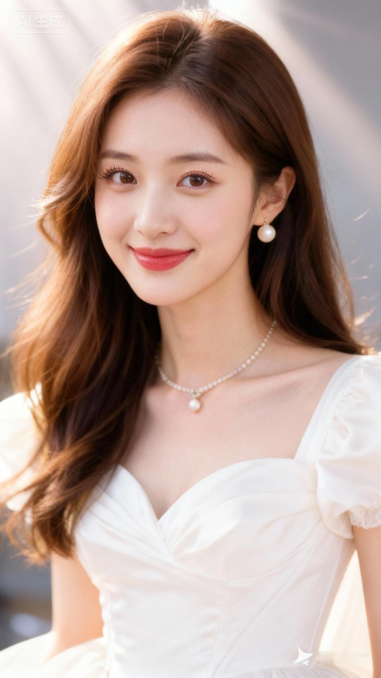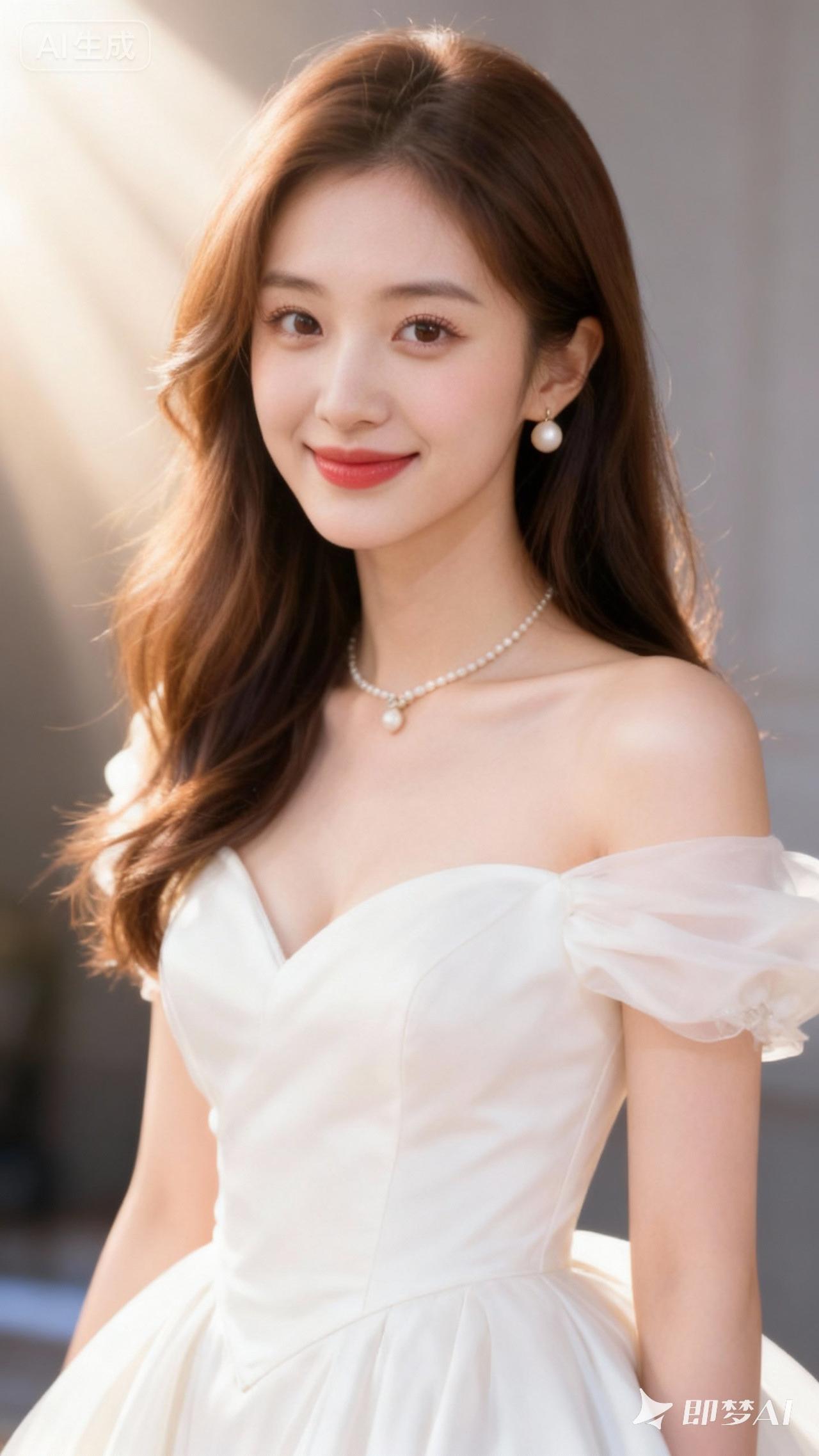 容颜清丽脱俗,娇俏甜美,人间尤物,清澈明亮的大眼睛,弯弯的柳眉,长长的睫毛,白到发光的肌肤,如玫瑰般娇艳欲滴的樱唇,是个难得一见的美人,琼鼻挺翘,肌肤如雪,气质出众,天姿国色,精致舞会妆容,穿着一袭白色高定连衣裙