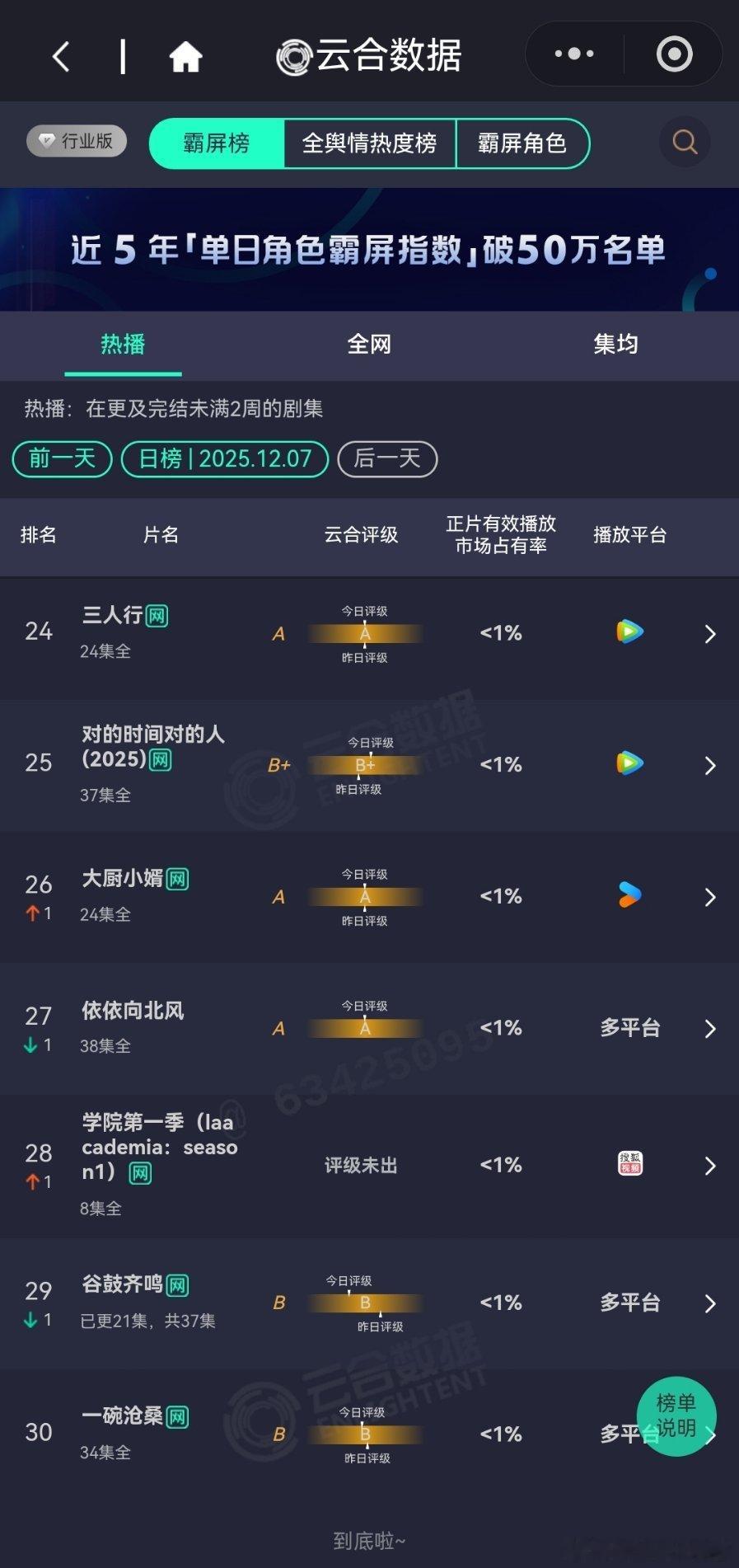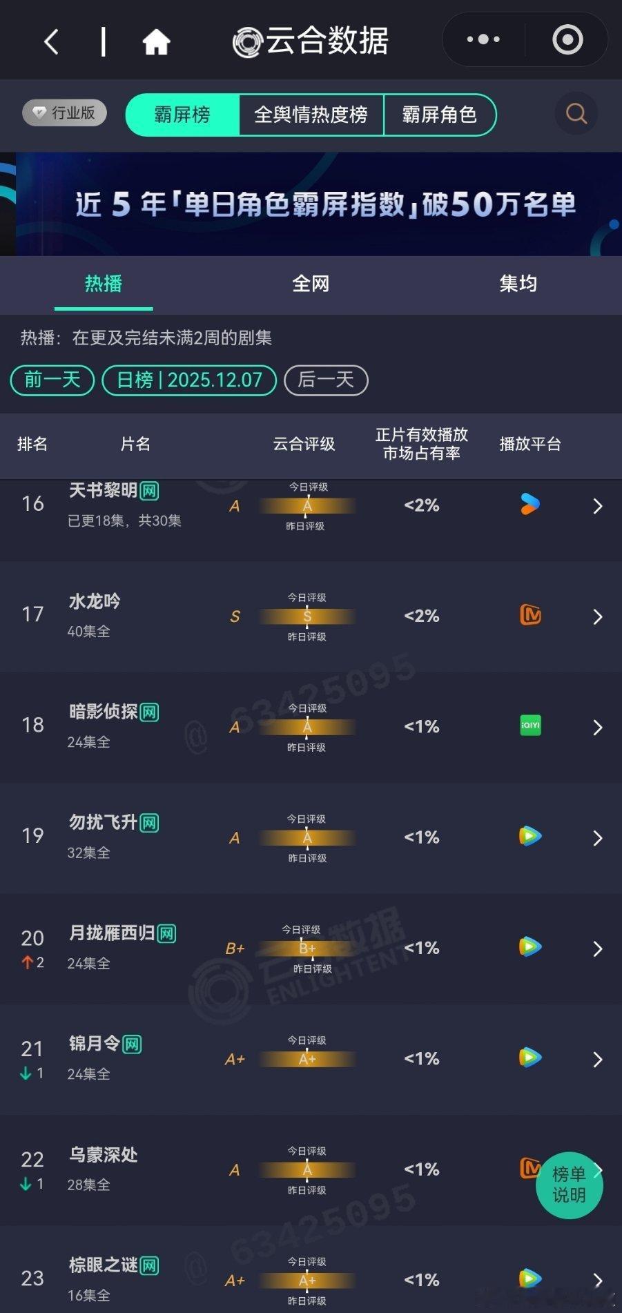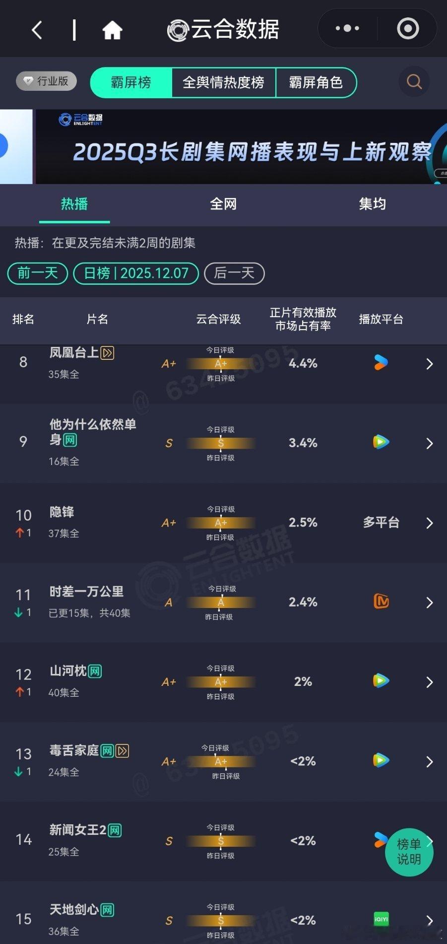 12月8日云合播放占比云合 大生意人云合19.5%大生意人 大生意人确实是越播越好了,即将破20%唐朝诡事录之长安13.6%枭起青壤11.1%评级又降到了S,已经超点,后面更难上去了。