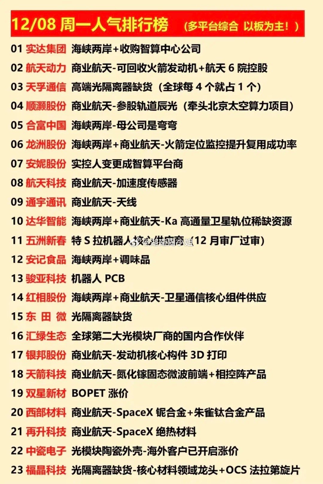 12/08周一 涨停板股票 人气龙虎榜!01实达集团:海峡两岸+收购智算公司02航天动力:商业航天-航天6院控股03天孚通信:高端光隔离器缺货04顺灏股份:商业航天-太空算力项目05合富中国:海峡两岸-母公司是弯弯06龙洲股份:海峡+商业航天+火箭定位07安妮股份:实控人变更成智算平台商08航天科技:商业航天-加速度传感器09通宇通讯:商业航天-天线10达华智能:海峡+商业航天-高通量卫星