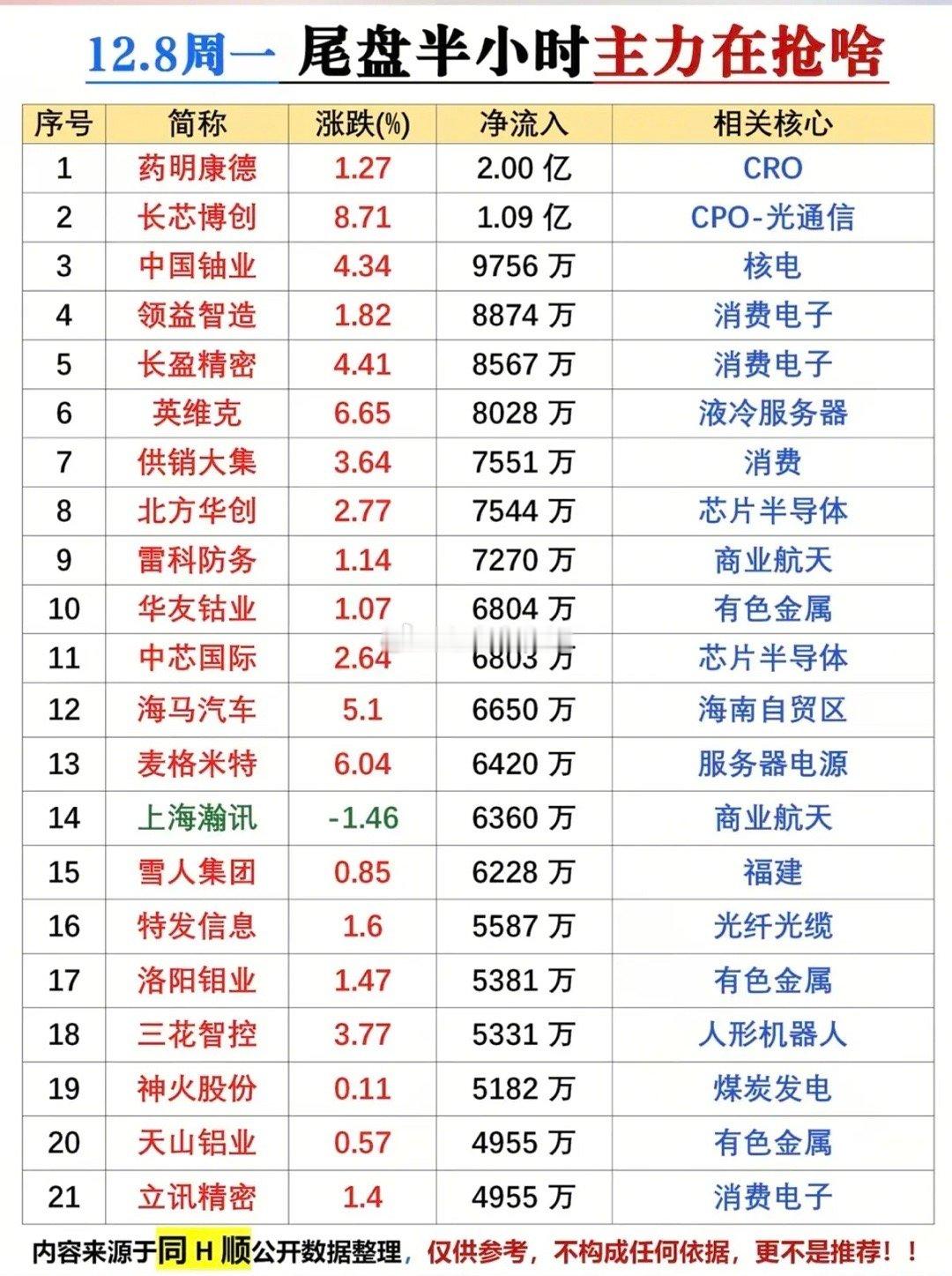 12.8周一 尾盘半小时 主力抢筹啥股票?尾盘主力抢筹焦点:1.CPO光通信2.存储芯片3.消费电子4.有色金属5.液冷服务器,服务器电源